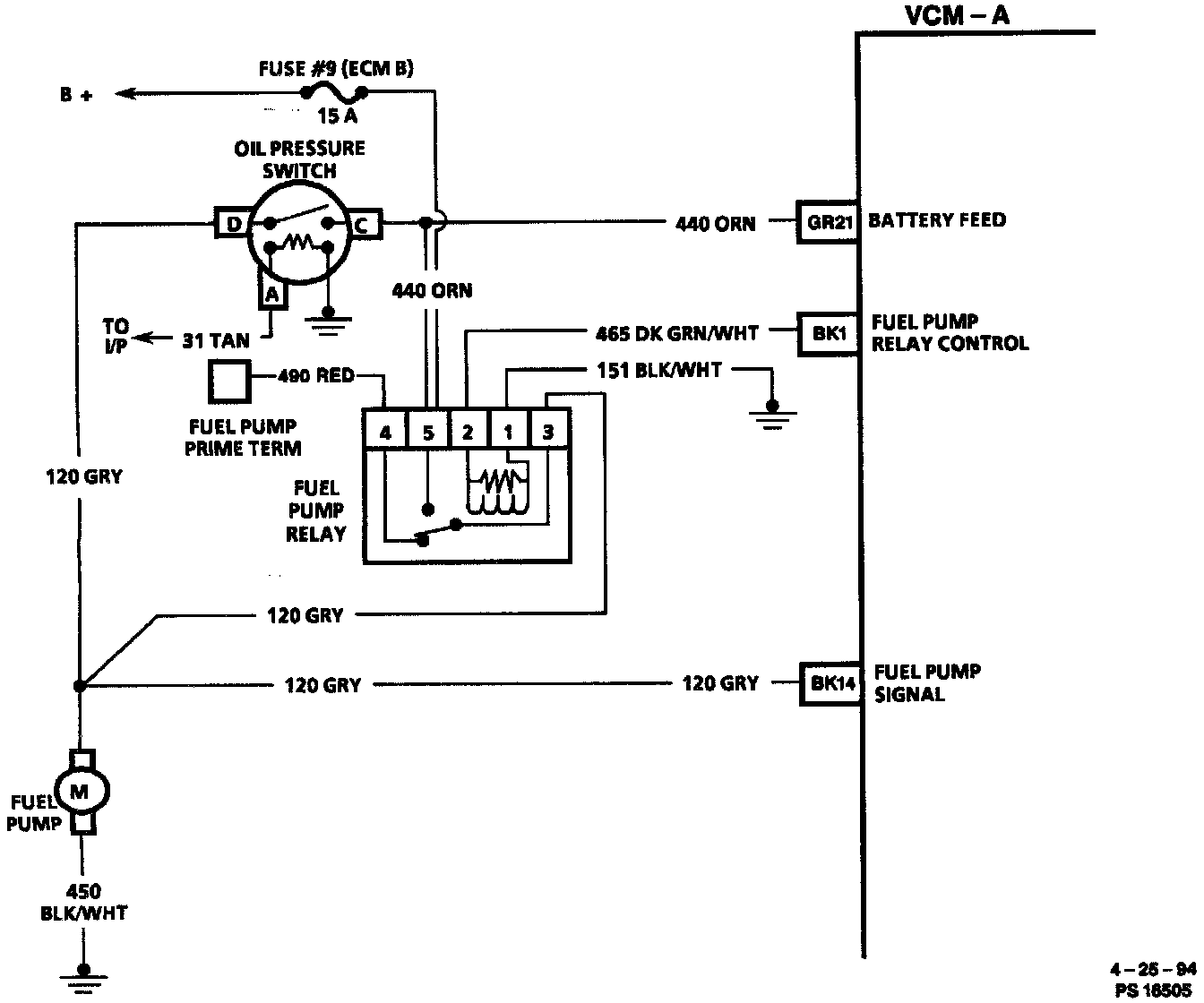 When the ignition switch is turned "ON," the Vehicle Control Module-A (VCM-A) will turn "ON" the in-tank fuel pump. It will remain "ON" as long as the engine is cranking or running, and the VCM-A is receiving reference pulses. If there are no reference pulses, the VCM-A will shut "OFF" the fuel pump within 2 seconds after ignition "ON" or engine stops.