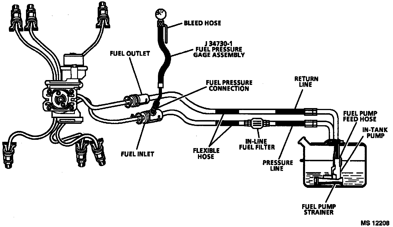 5. Restricting the fuel return line allows fuel pressure to build above regulated pressure, with battery voltage applied to the pump "test" terminal, pressure should rise above 420 kPa (61 psi) as the valve in the return line is partially closed.