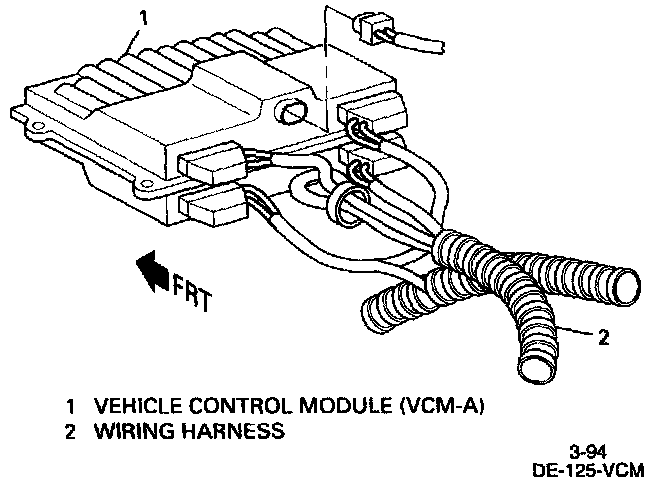 The Vehicle Control Module (VCM-A) is an electronic device which monitors inputs to control various transmission functions including shift quality and transmission diagnostics. The VCM-A receives input information from sensors, switches, and components to process for use within its' control program. Based on this input information, the VCM-A controls various transmission output functions and devices. The VCM-A is located within the engine compartment, on the right front wheelhouse.