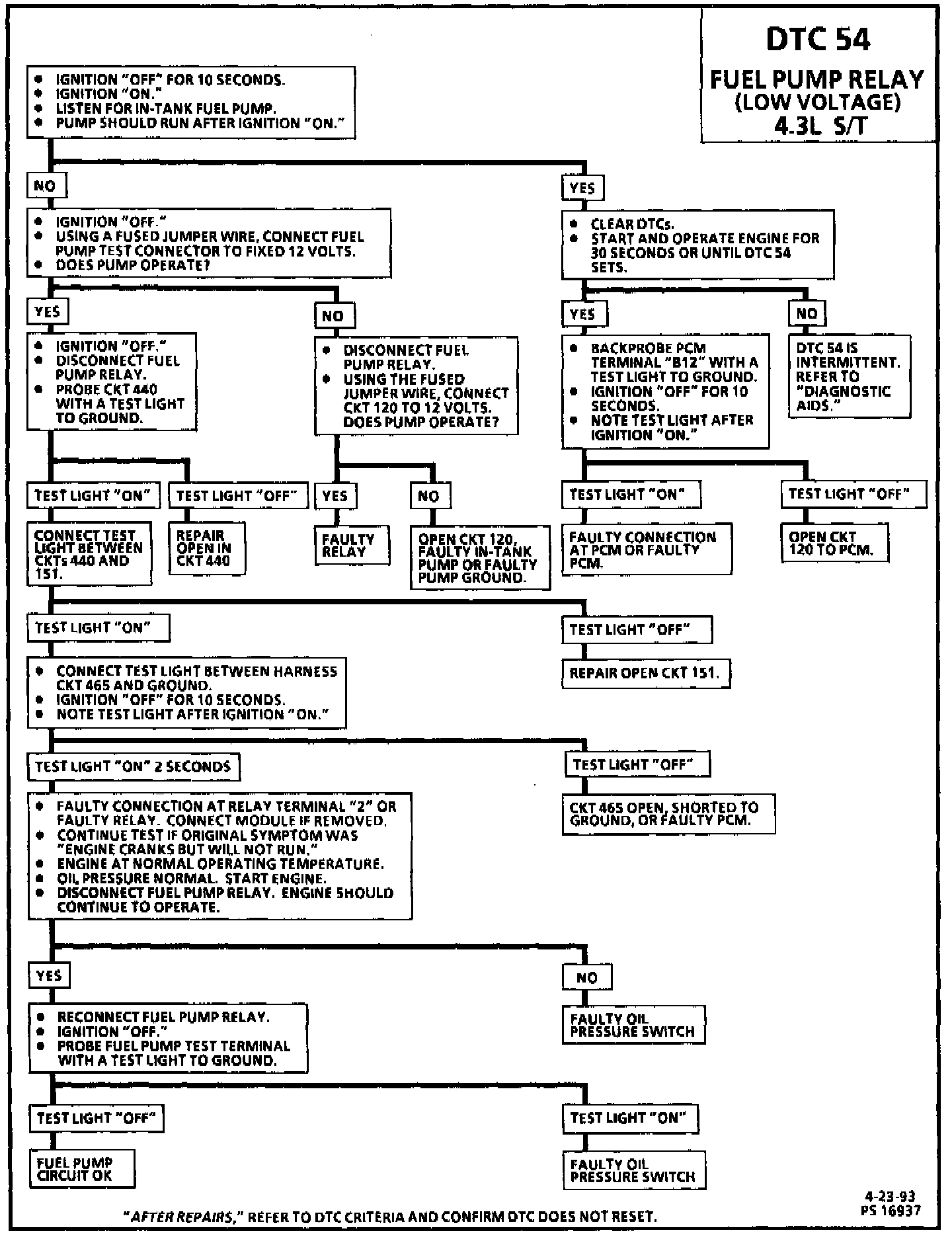 DTC 54 will set if the voltage at terminal "B12" is less than 2 volts for 1.5 seconds since the last reference pulse was received. This DTC is designed to detect a faulty relay, causing extended crank time, and the DTC will help the diagnosis of an engine that "Cranks But Will Not Run."