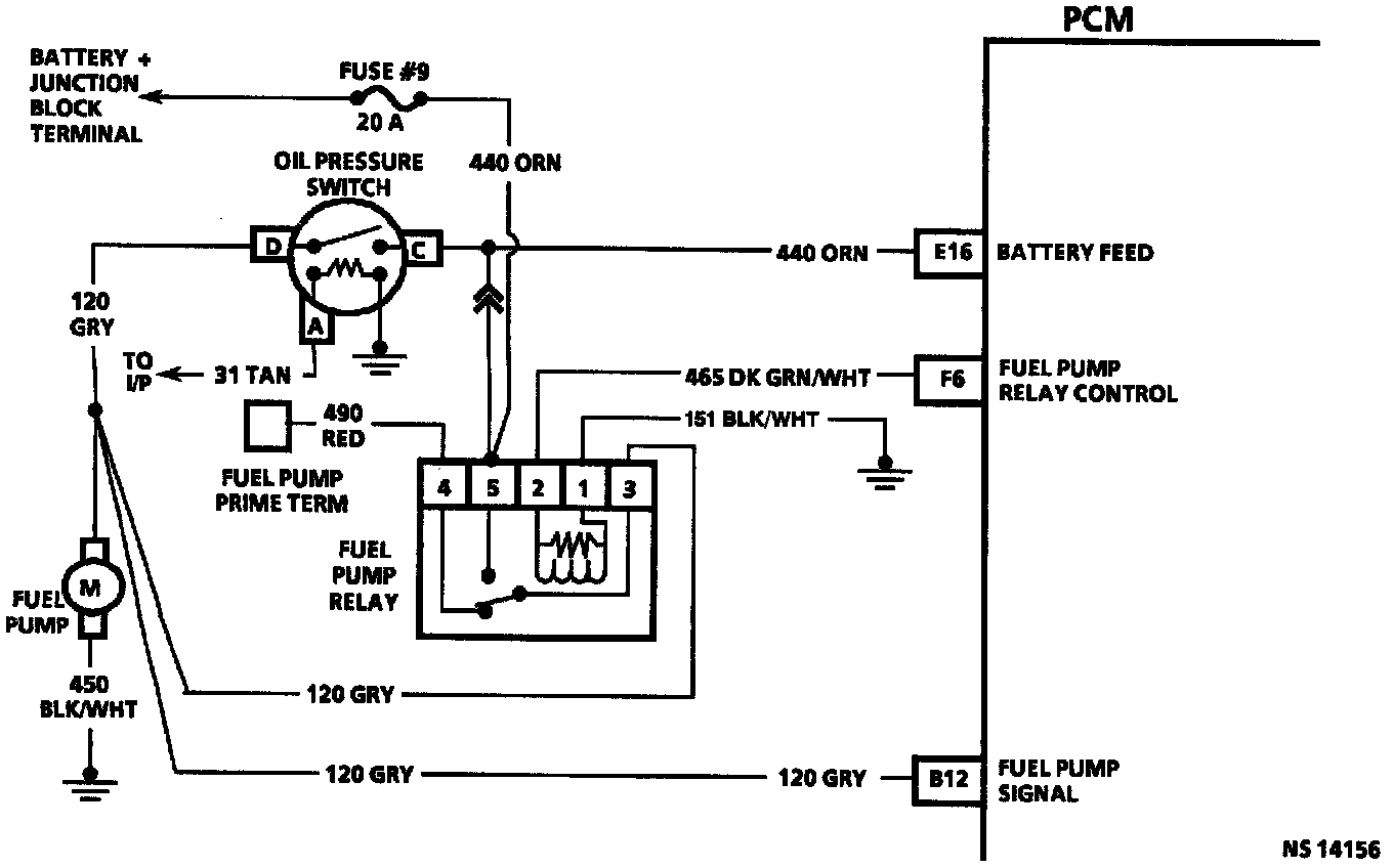 The status of the fuel pump CKT 120 is monitored by the PCM at terminal "B12" and is used to compensate fuel delivery based on system voltage. This signal is also used to store a DTC if the fuel pump relay is defective or fuel pump voltage is lost while the engine is running. There should be about 12 volts on CKT 120 for at least 2 seconds after the ignition is turned "ON," or any time reference pulses are being received by the PCM.