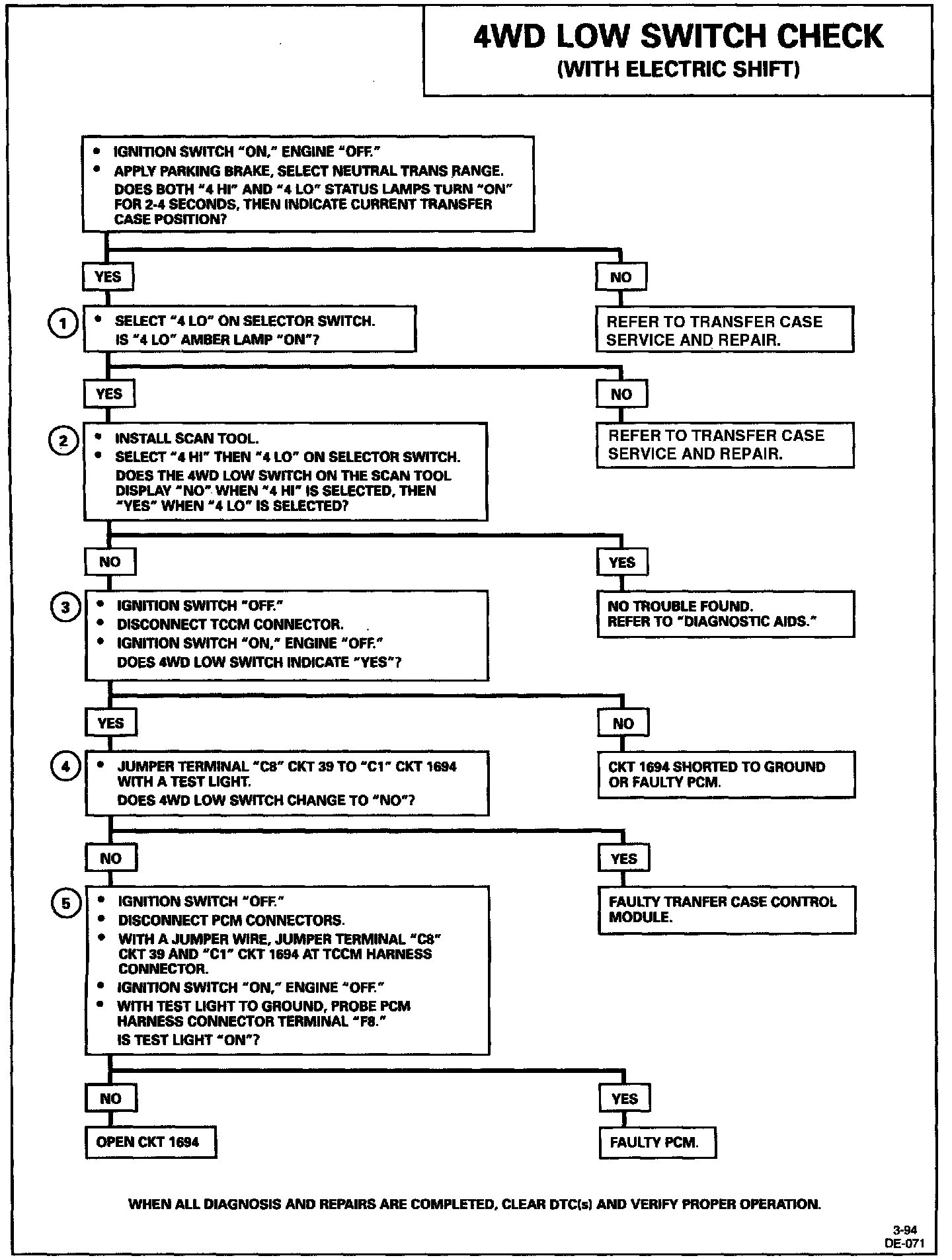 No DTC(s) will be set; however, if CKT 1694 is shorted to B+, and the transfer case is in 4WD low position, the transmission will have late upshifts in 4WD low. If CKT 1694 is shorted to ground or open, the transmission will have an early shift pattern.