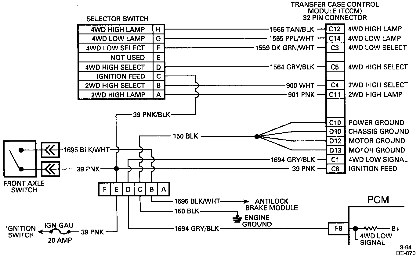 The 4WD low circuit consists of a selector assembly, Transfer Case Control Module (TCCM), front axle switch and wiring. When the operator selects 4WD low, a momentary signal will be sent from the selector switch to the TCCM. If all conditions for 4WD low have been met, the TCCM will allow the electric motor in the transfer case to make the shift. When 4WD low is engaged, CKT 1694 voltage to the Powertrain Control Module (PCM) will change from B+ to zero. The 4WD low switch signal is used to correct the transmission output speed signal from the Vehicle Speed Signal (VSS) buffer module to the PCM. This signal is used to compensate for transfer case gear reduction. The PCM uses the transmission output speed signal to adjust shift points, line pressure and TCC scheduling.