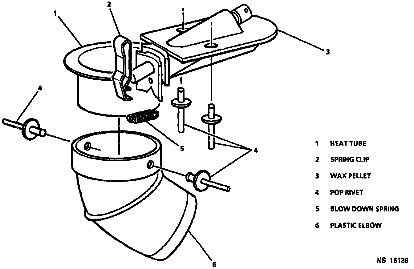 3. Plastic heat tube elbow in the correct orientation, using two pop rivets. If application does not have an elbow, skip this step.