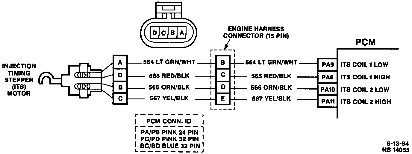 4. The important thing in this step is that the PCM is sending a varying voltage (voltage will vary between 1 and 12), this will indicate that the PCM is OK and that there is a problem with the injection timing stepper motor. If there is a steady voltage present on any circuit, this will indicate a problem with the PCM or a circuit shorted to voltage.