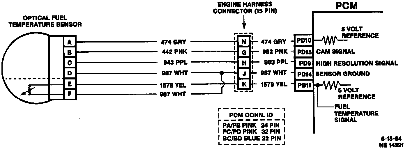 The fuel temperature sensor is a thermistor that controls signal voltage to the Powertrain Control Module (PCM). When the fuel is cold, the sensor resistance is high, therefore the PCM will see high signal voltage. As fuel warms, sensor resistance becomes less and voltage drops. The fuel temperature sensor is integrated with the optical sensor.
