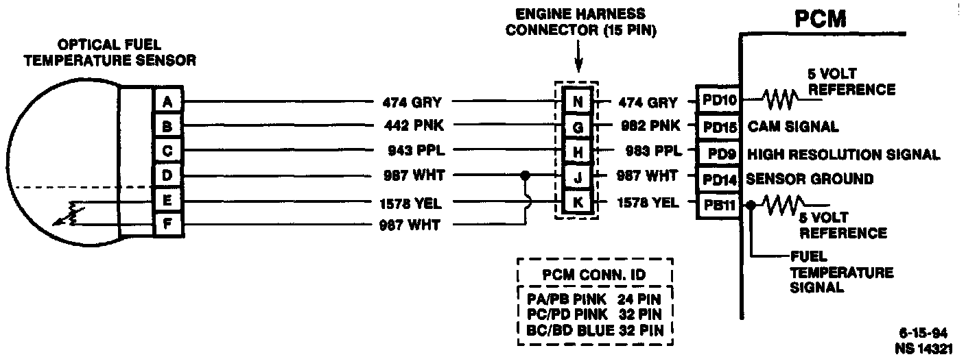 The fuel temperature sensor is a thermistor that controls signal voltage to the Powertrain Control Module (PCM). When the fuel is cold, the sensor resistance is high, therefore the PCM will see high signal voltage. As fuel warms, sensor resistance becomes less and voltage drops. The fuel temperature sensor is integrated with the optical sensor.