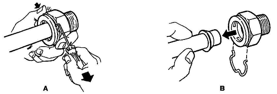 - Using a small pick-type tool and your thumb (A in image), grasp the connector end and pull the clip from the connector (B in image). This releases the cooler line from the connector.
