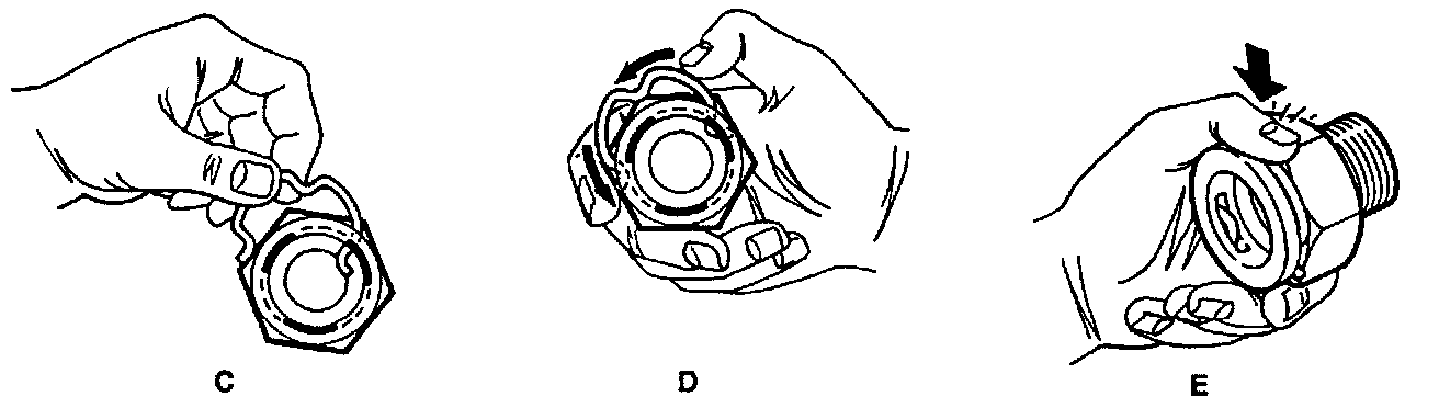 - Using your thumb and forefinger, insert the connector clip into one of the three recesses in the connector (C in image). With one end of the clip engaged in the connector slot, use your thumb and rotate the clip around the connector until it snaps into place (D and E in image).