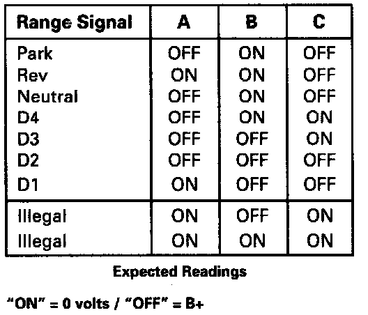 Refer to accompanying chart for various A/B/C range combinations. Check all wiring connectors for proper terminal tension. For current DTC 28, range signal will default to "D4" while A/B/C range values continue to read actual "TR Pressure Switch Output" for each range selection.