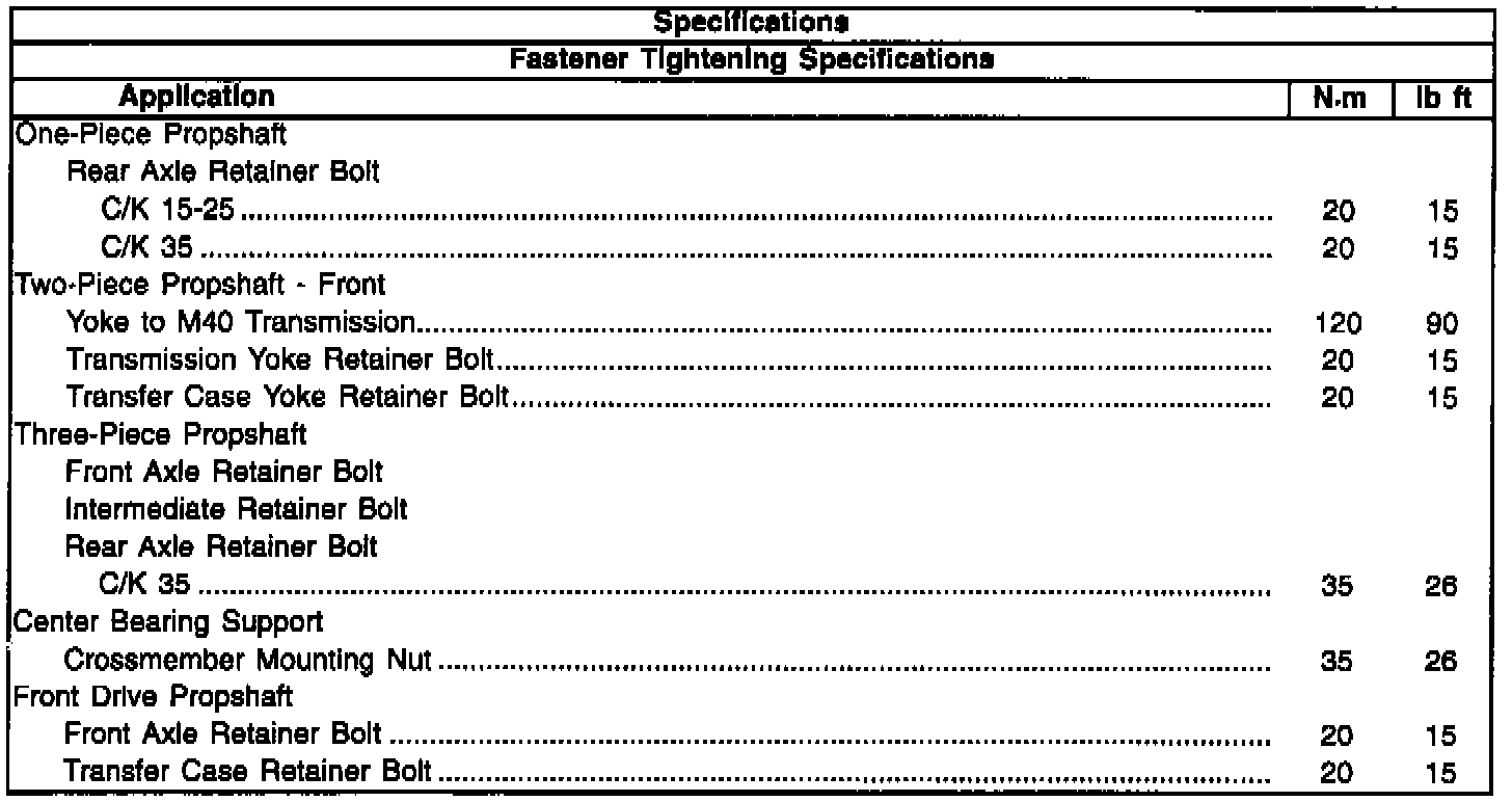 A correction to Section 4A "Propeller Shaft" of the 1995 C/K Truck Service Manual has been made. The art depicting the front drive propeller shaft connecting to the transfer case and the torque callout has been changed. In addition, the fastener tightening specification chart has been updated to reflect the torque change.