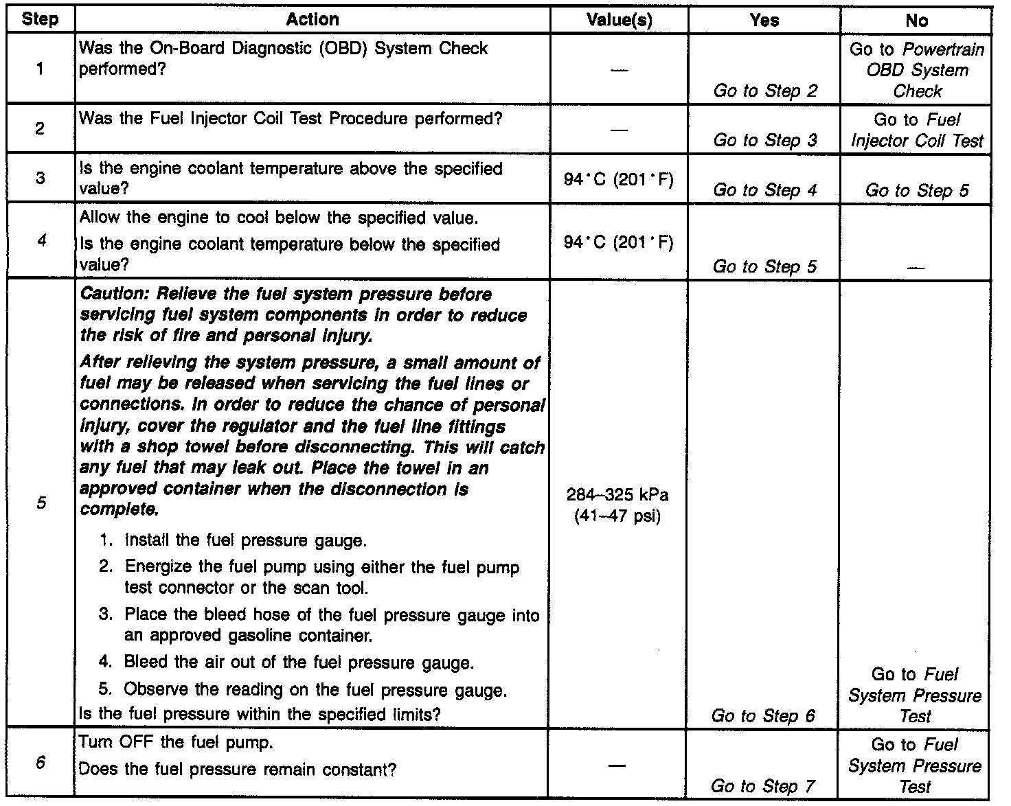 5. The fuel pressure should be within the specified range. If the fuel pressure is not within the specified range, refer to Fuel System Pressure Test. System Diagnosis - Fuel System Pressure Test