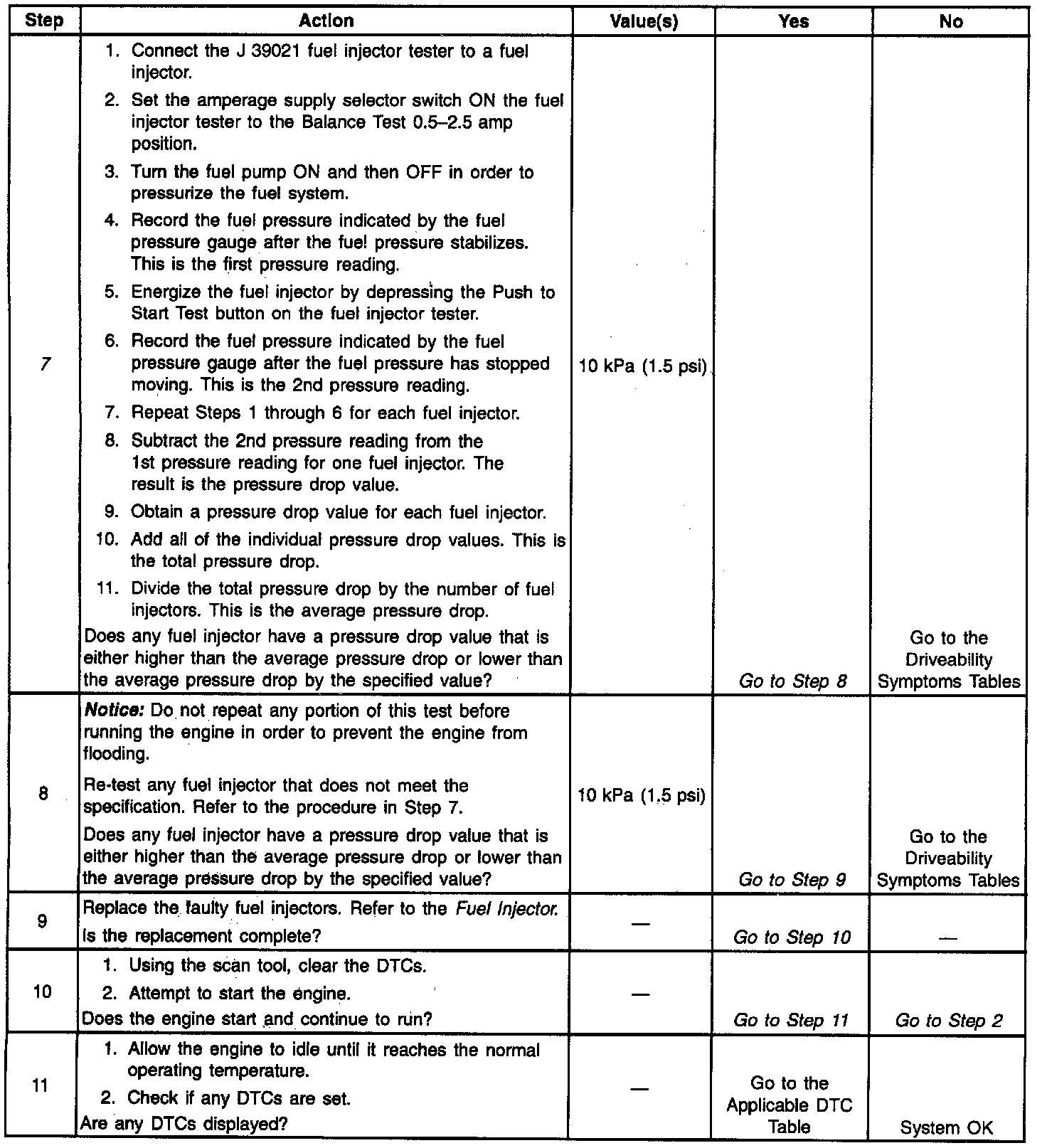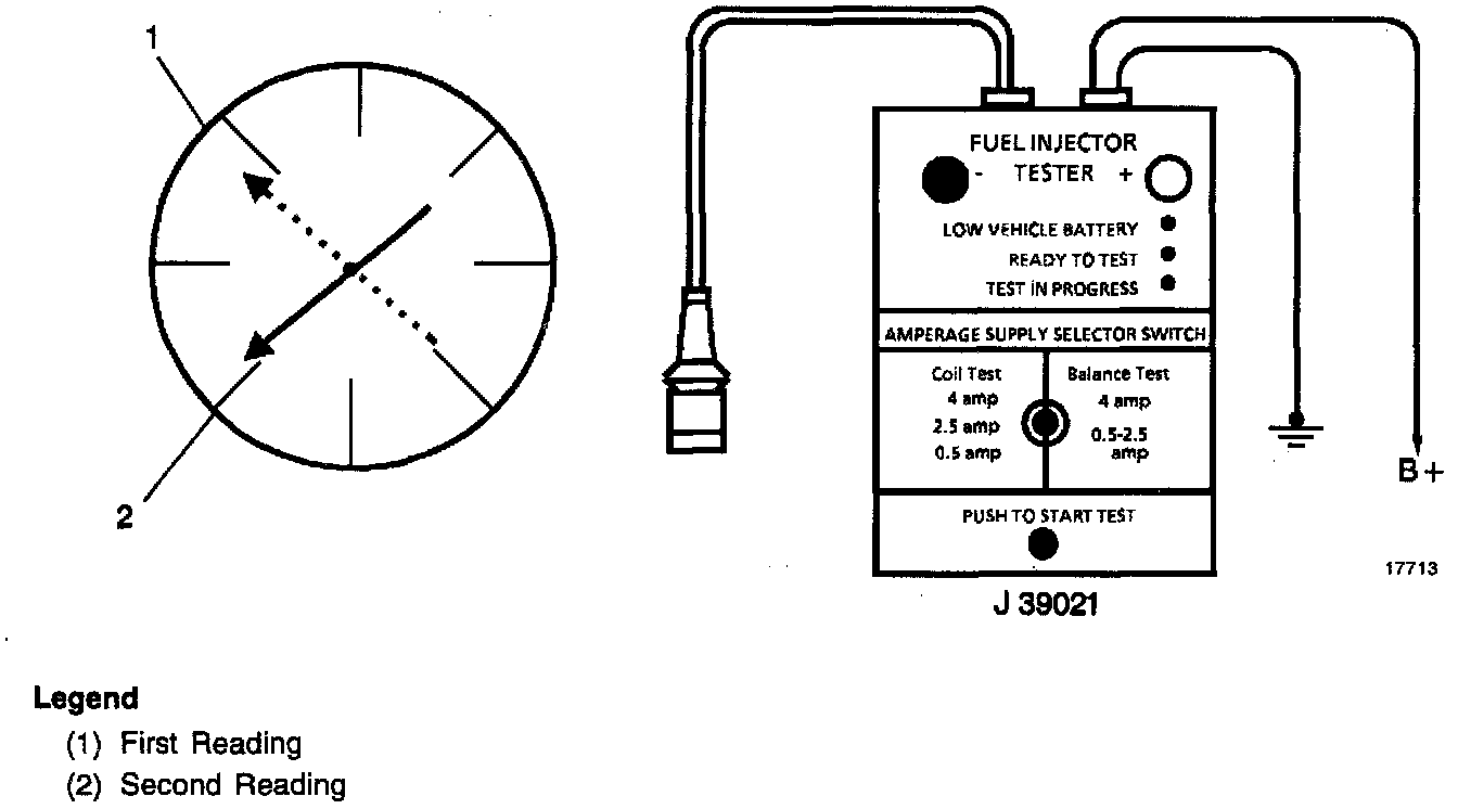 Use the Fuel Injector Tester (J 39201) in order to energize the injector for a precise amount of time, thus allowing a measured amount of fuel into the manifold. This causes a drop in the fuel rail pressure that can be recorded and used to compare to each injector. All injectors should have the same pressure drop ±1O kPa (1.5 psi).