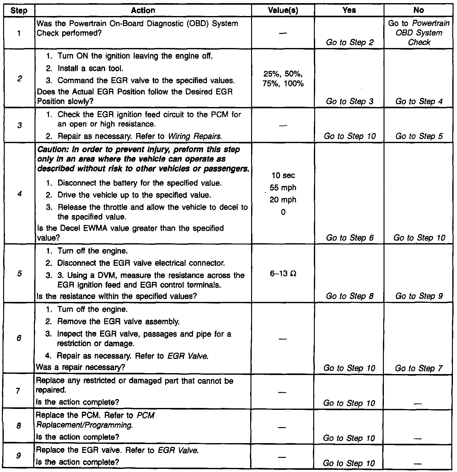 A more negative number (less than -3) indicates that the system is working normally whereas a positive number indicates that the system is being restricted and that the expected amount of EGR flow is incorrect. A number that falls between negative 3 and positive 2 indicates that the system is partially restricted but not restricted enough to fail. The Decel EWMA value should always be a -3 or lower. If the Decel EWMA number becomes more positive (towards 0 or more), then the EGR system is becoming restricted. Look for possible damage to the EGR pipe or for a restriction caused by carbon deposits in the EGR passages or on the EGR valve.
