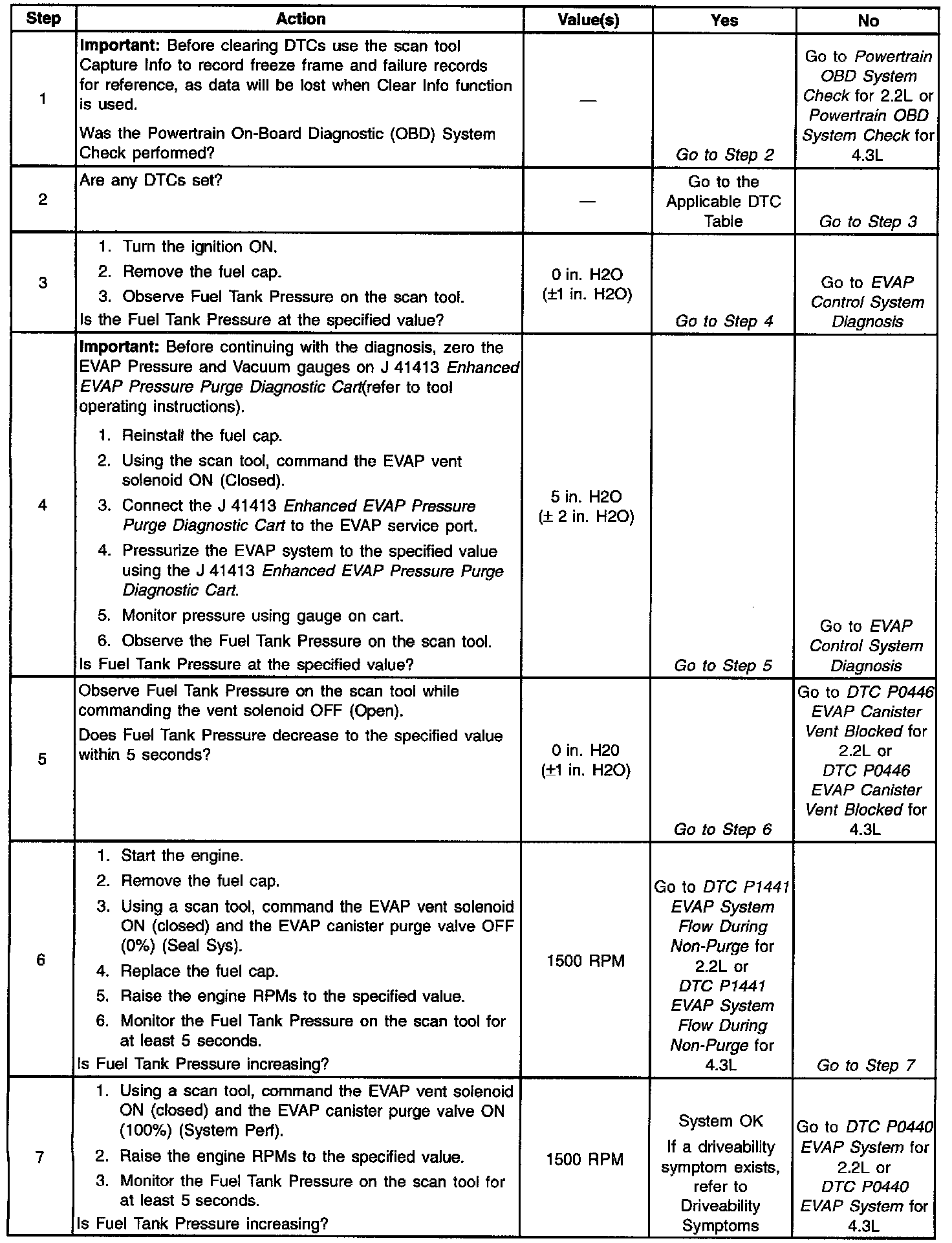 Applying a vacuum to the Evaporation Emission (EVAP) system and monitoring for a vacuum decay checks the evaporative emission system. The Control Module monitors the vacuum level through the fuel tank vacuum sensor signal. At an appropriate time, the EVAP canister purge valve and the EVAP vent solenoid turn ON, allowing the engine to draw a small vacuum on the entire evaporative emission system. After the desired vacuum level has been achieved, the EVAP canister purge valve turns OFF, sealing the system. A leak is detected by monitoring for a decrease in vacuum level over a given time period, when all other variables remain constant. A leak, blockage or faulty component in the system causes a DTC to set.
