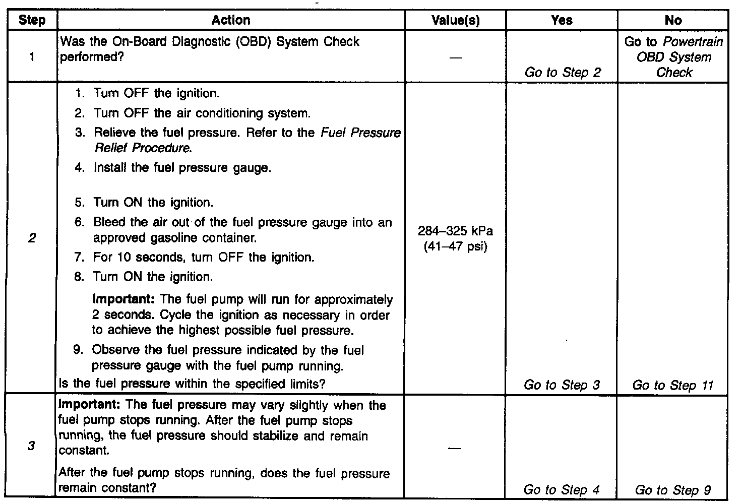 2. In order to relieve the fuel pressure, refer to Fuel Pressure Relief Procedure. With the ignition switch ON and the fuel pump running, the fuel pressure indicated by the fuel pressure gauge should be 284-325 kPa (41-47 psi).
