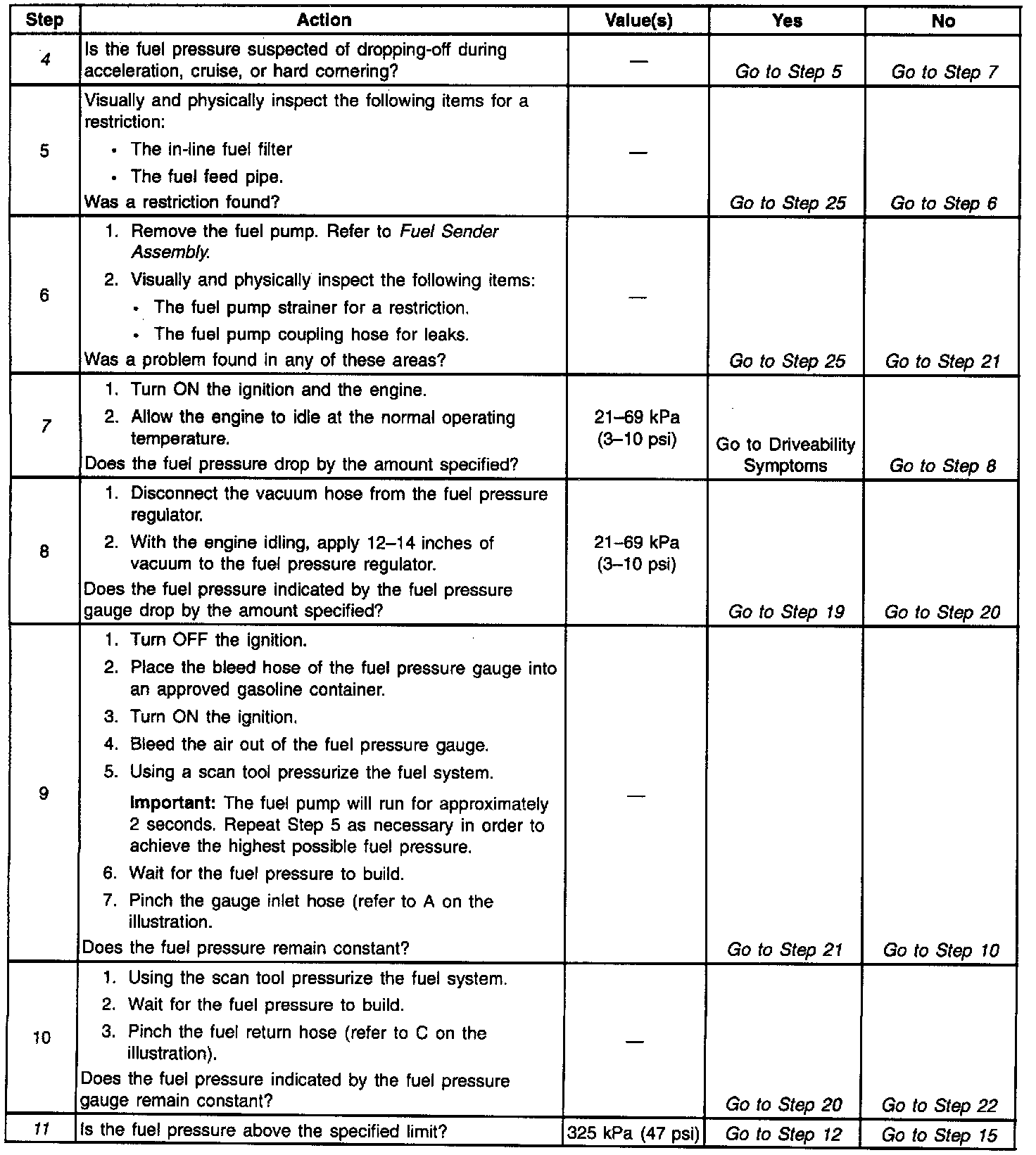 4. A fuel pressure which drops off during acceleration, cruise, or a hard cornering may cause a lean condition. A lean condition can cause a loss of power, surging, or a misfire. A scan tool can diagnose a lean condition. If an extremely lean condition occurs, the Oxygen Sensors will stop toggling. The oxygen sensor output voltages will drop below 500 mV. Also the Fuel Injector Pulse Width will increase.