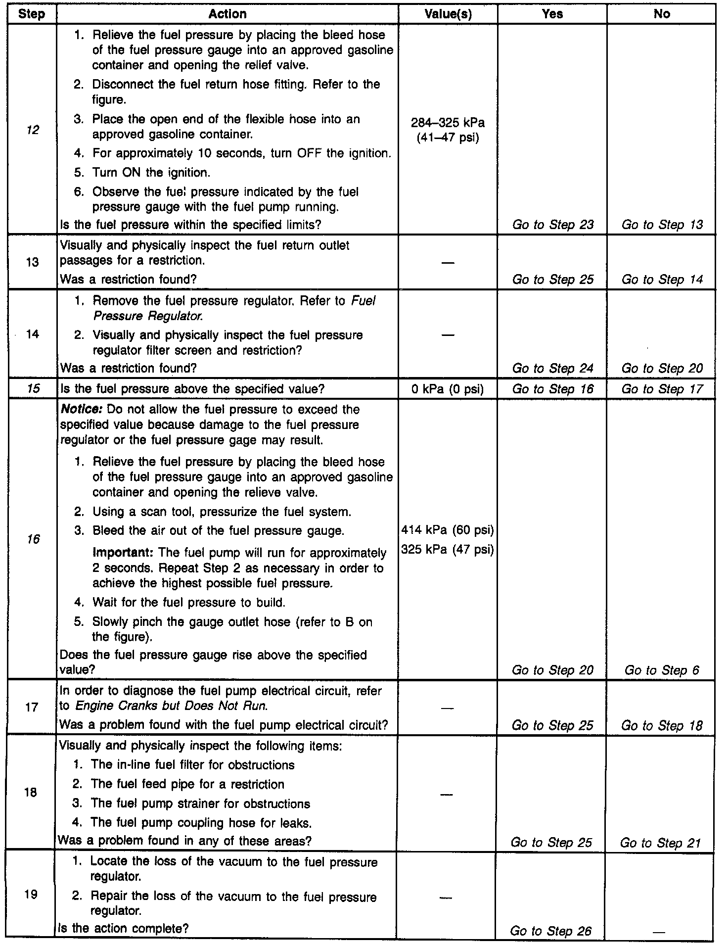 12. This test determines if the high fuel pressure is due to a restricted fuel return pipe or if the high fuel pressure is due to a faulty fuel pressure regulator.