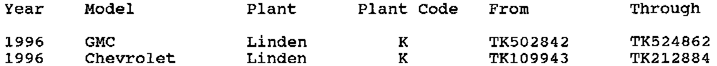Involved are CERTAIN 1996 Sonoma/S 10 two-wheel drive Pickup Trucks equipped with 4.3L engine (LF6) and manual 5 speed transmission (M50) and built at the Linden Assembly plant within the following VIN breakpoints: