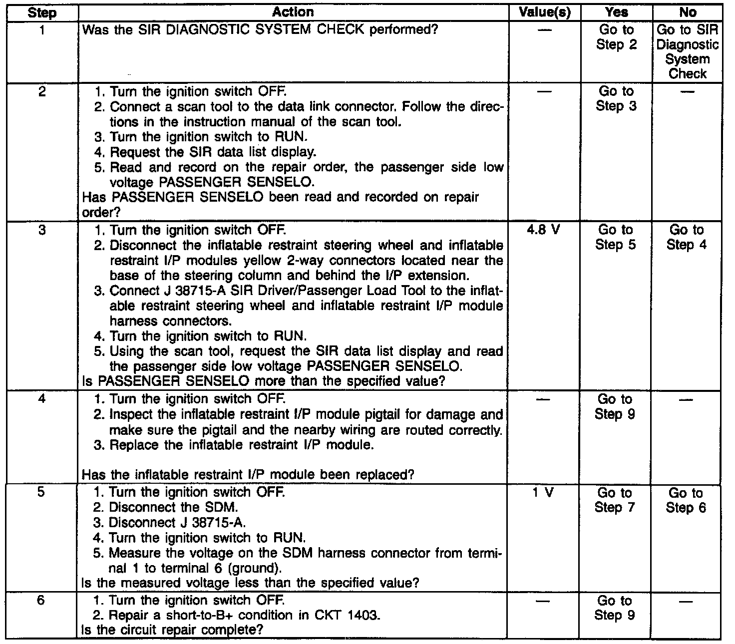 The diagnostic table directs the technician to note the entry value of PASSENGER SENSELO. Comparing the value of PASSENGER SENSELO can be helpful in determining if an intermittent condition exists.