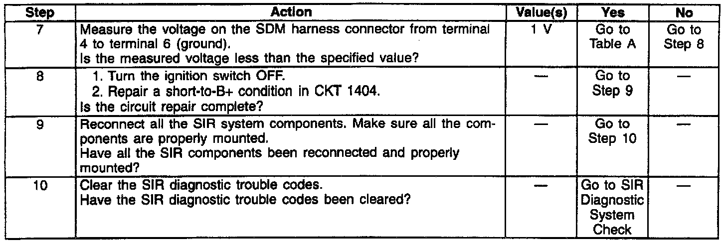 A short-to-B+ in the inflatable restraint I/P module circuit can cause an intermittent condition. Inspect CKTs 1403 and 1404 carefully for cuffing or chafing. Wiring pigtail damage requires replacement of the inflatable restraint I/P module.
