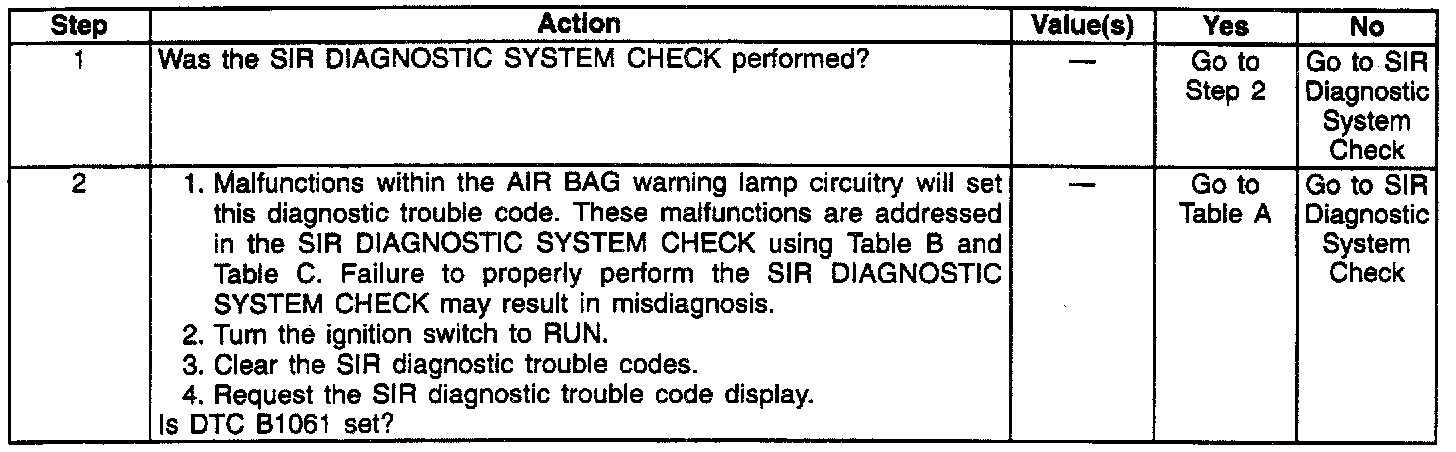 Refer to TABLES B and C to diagnose warning lamp circuit malfunctions. Table B Air Bag Warning Lamp Comes On Steady