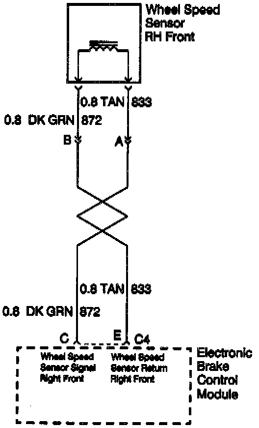 When inspecting a wheel speed sensor, inspect the sensor terminals and hamess connector for corrosion. If evidence of corrosion exists, replace the wheel speed sensor. Refer to Wheel Speed Sensor, Service and Repair. Service and Repair