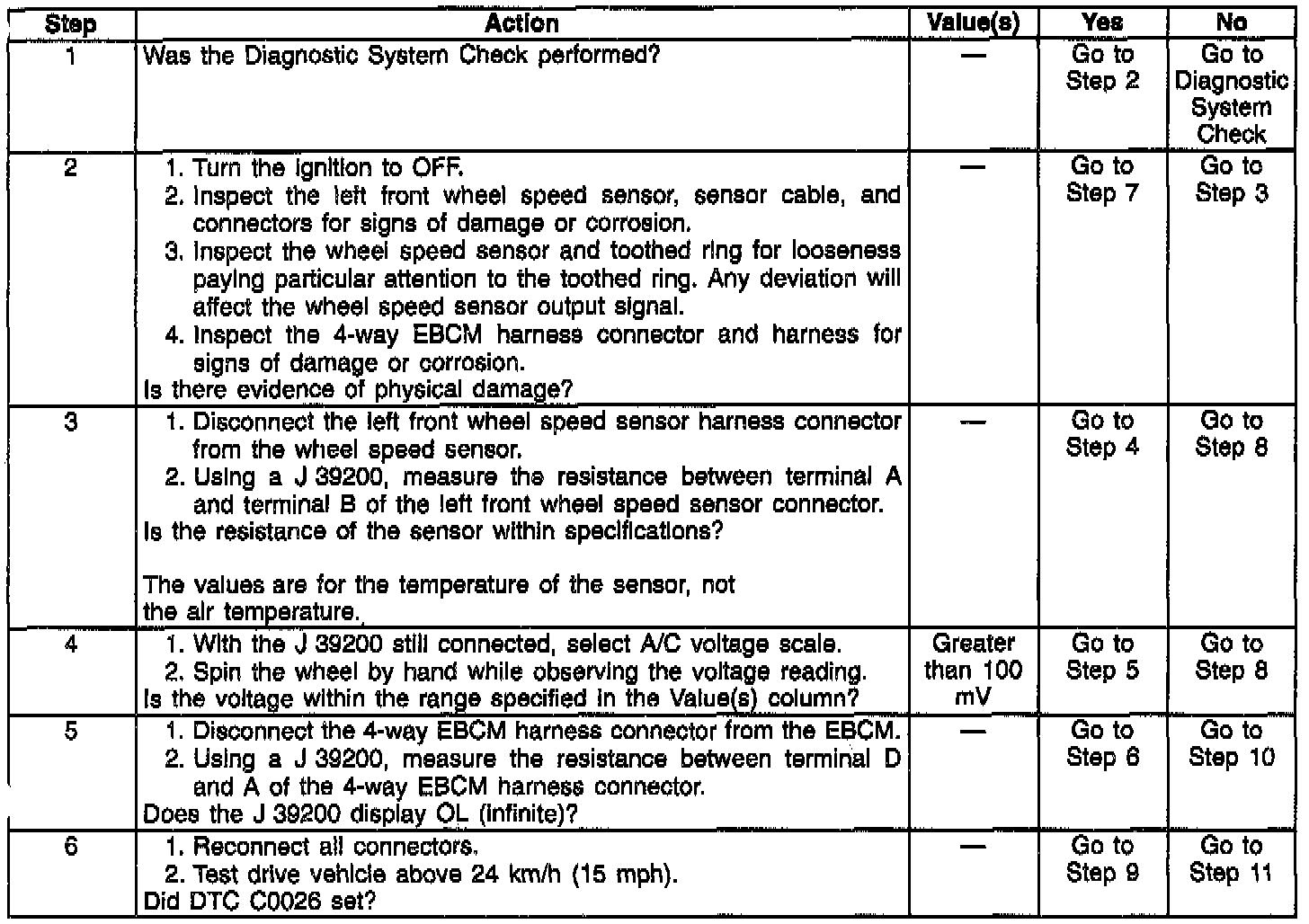 NOTE: Resistance of the wheel speed sensor will increase with an increase in sensor temperature. Refer to the following table for temperature/resistance values.