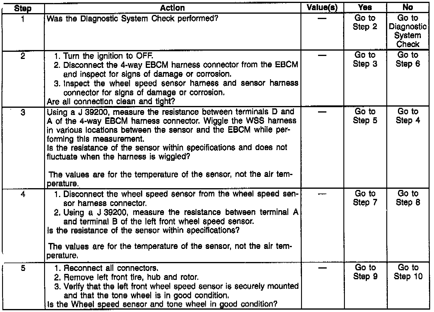 NOTE: Resistance of the wheel speed sensor will increase with an increase in sensor temperature. Refer to the following table for temperature/resistance values.