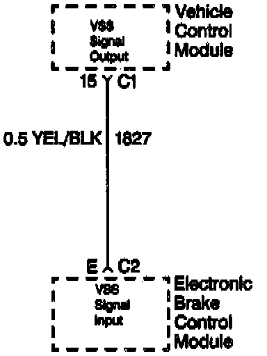 The rear wheel speed signal originates from the Vehicle Speed Sensor (VSS) which is connected to the Vehicle Control Module (VCM). The Electronic Brake Control Module (EBCM) receives the rear wheel speed signal from the VCM.