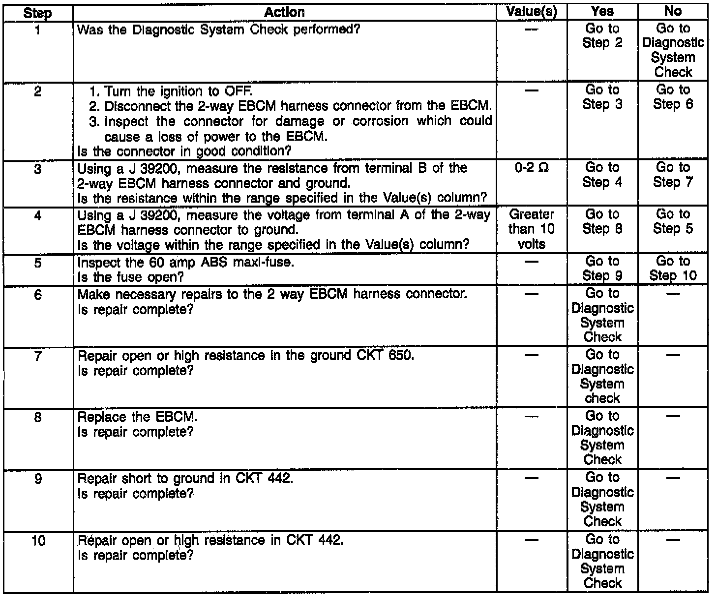 EBCM microprocessor commands the relay on low voltage on all eight solenoid driver circuits when all are expected to be high (solenoid not energized)