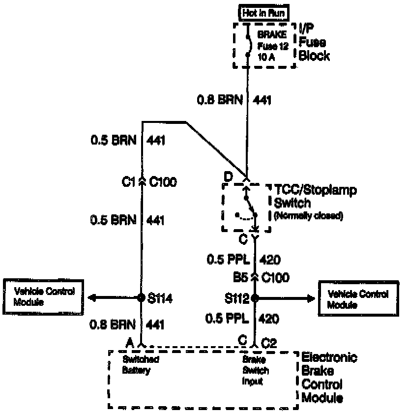The stoplamp switch is a normally closed switch. With the ignition in the RUN position and the brake pedal not depressed ignition voltage will be present at the Electronic Brake Control Module (EBCM). When the brakes are applied, the ignition voltage present at the EBCM will be zero.