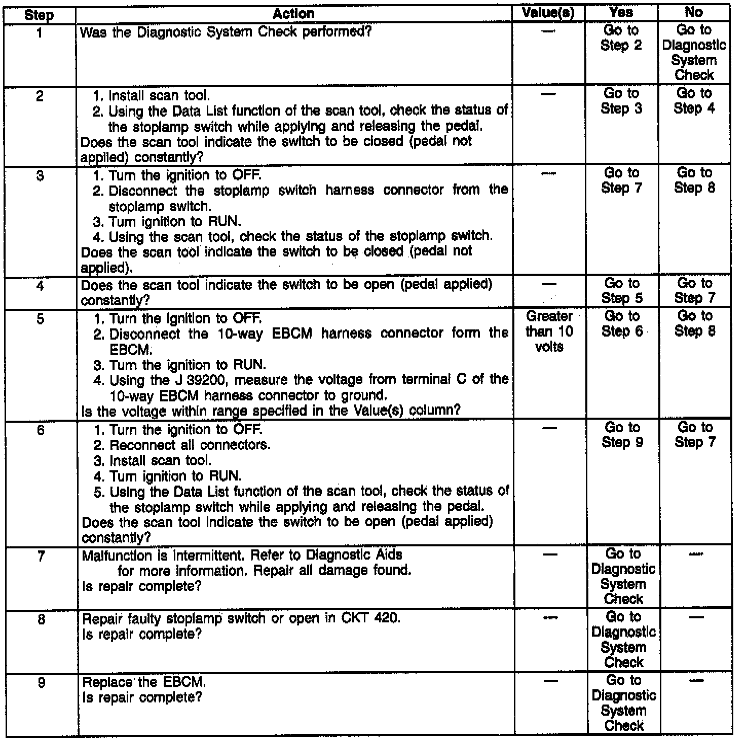 5. Check for an open in circuit 420 or faulty stoplamp switch.