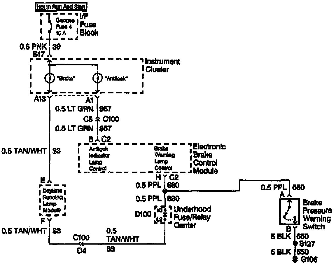 The red BRAKE warning lamp is supplied ignition voltage through the GAUGE fuse. The BRAKE waning lamp can be illuminated by the Electronic Brake Control Module (EBCM), Daytime Running Lamps (DRL) Module, Brake Pressure Differential Switch or by the Park Stoplamp switch. If a code C0088 sets, the EBCM will store the code in memory but will not disable the Antilock Brake System (ABS). If a code C0088 is in memory, the EBCM will not attempt to perform the bulb check at start-up.
