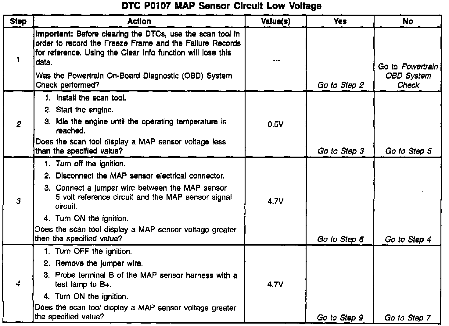 An intermittent open in MAP signal circuit or 5 volt reference circuit will result in a DTC P1107.