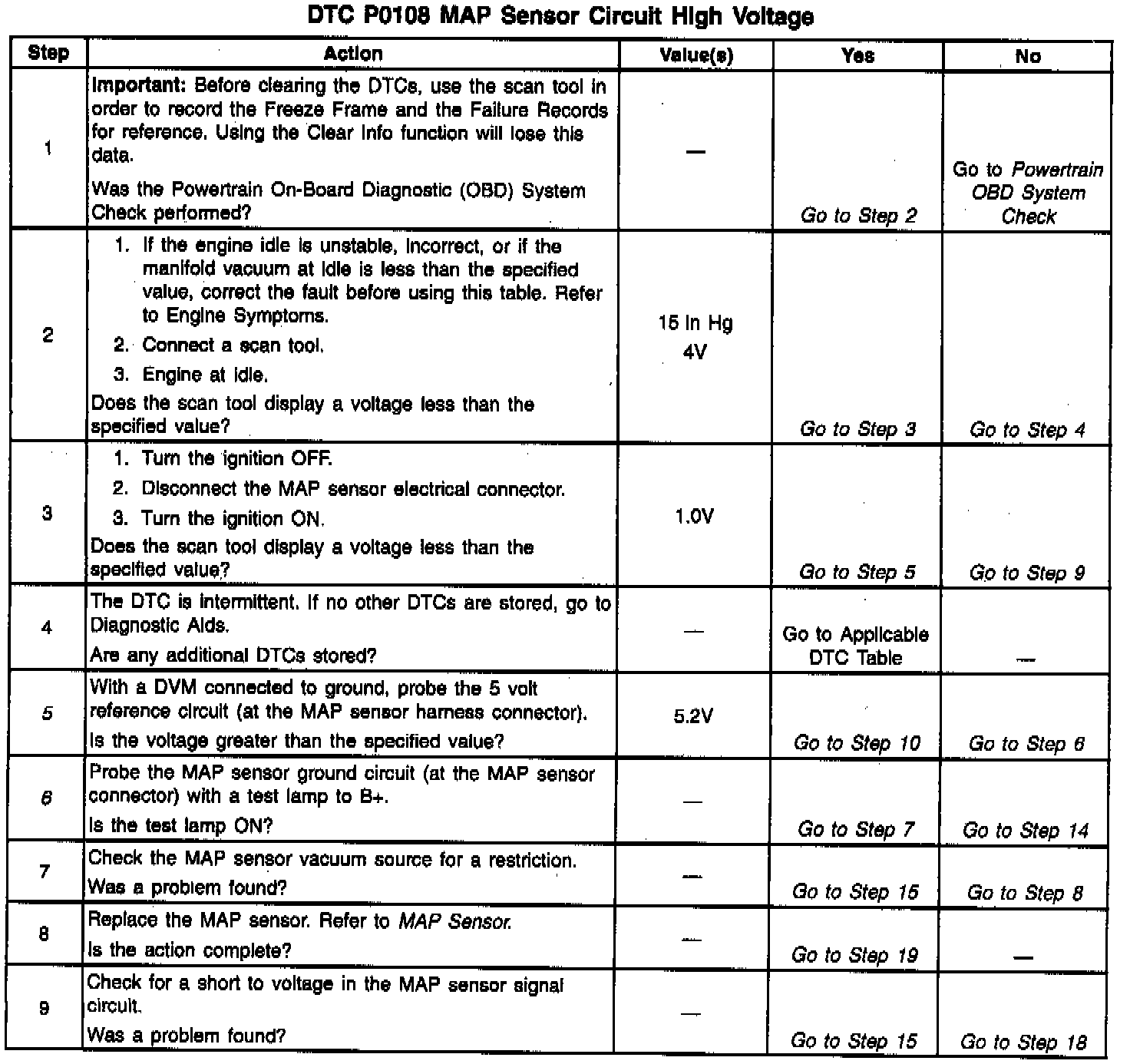 The Manifold Absolute Pressure (MAP) sensor responds to changes in intake manifold pressure (vacuum). A 5 volt reference is applied to the sensor on the 5 volt reference circuit. A variable resistor moves in relation to the manifold pressure and a voltage signal is sent back to the VCM on the MAP signal circuit. This voltage signal varies from 1.0-1.5 volts at closed throttle to 4.0-4.6 volts at wide open throttle (low vacuum). The VCM utilizes the MAP signal and throttle position in order to determine the correct amount of fuel delivered to the engine. This DTC is a type A DTC.