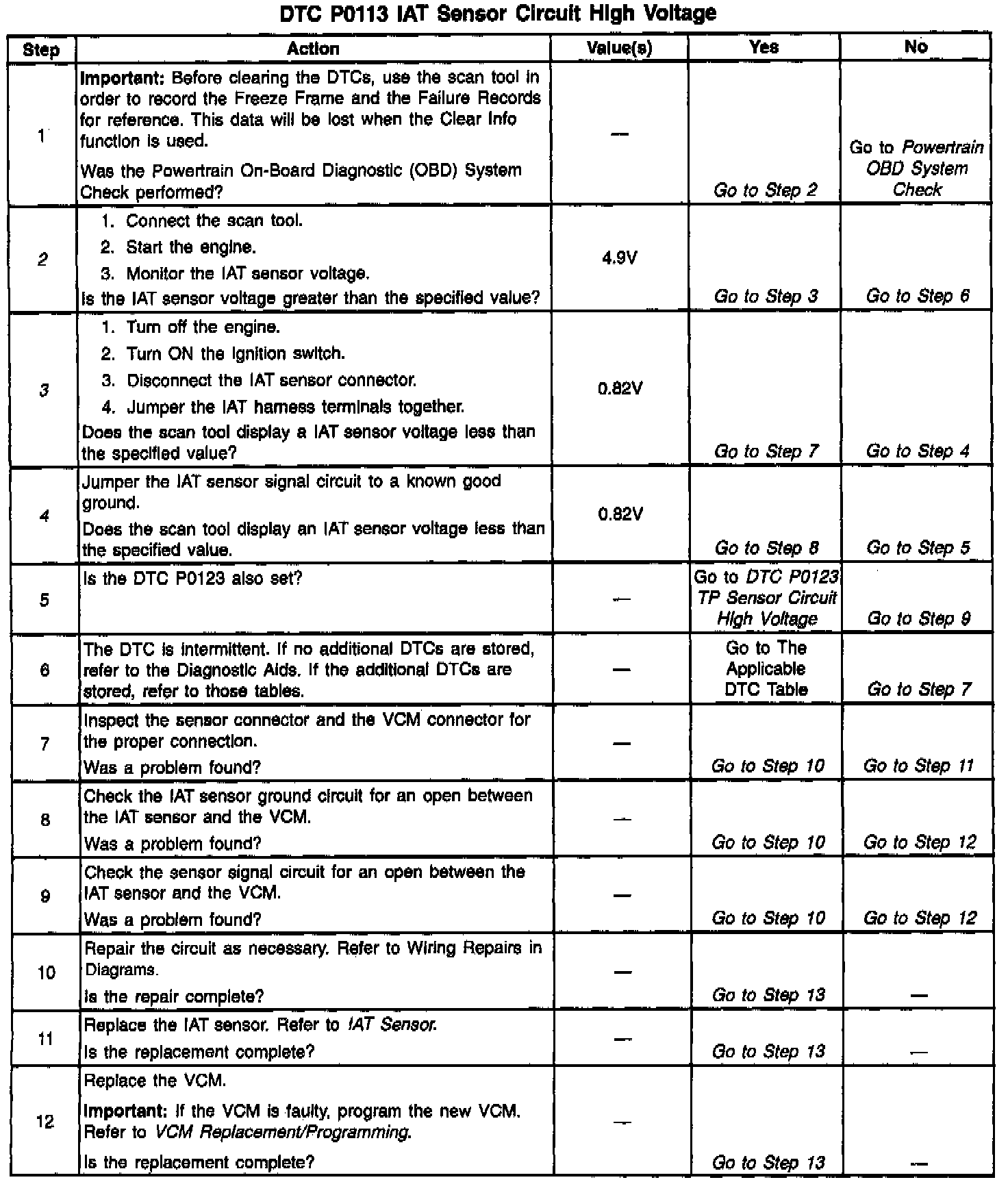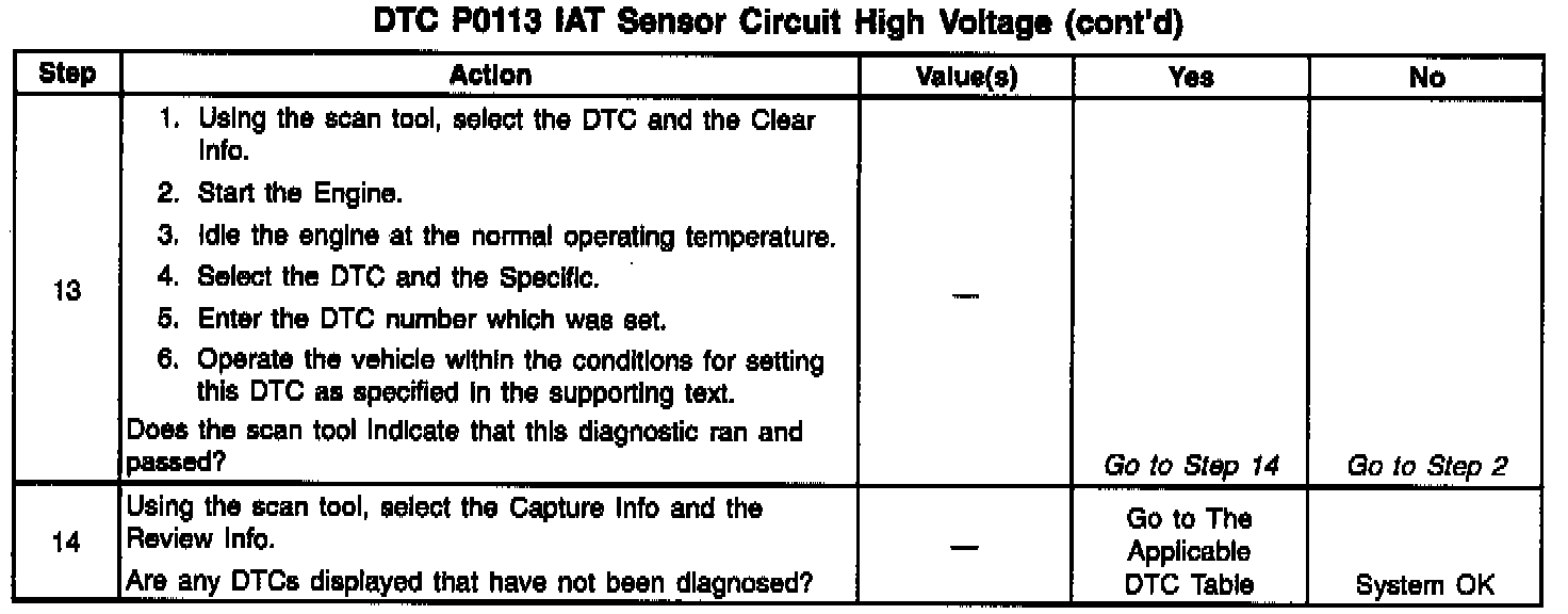 2. If the IAT sensor circuit voltage measures greater than 4.9 volts, the conditions for the DTC are still present, and the problem is not intermittent.