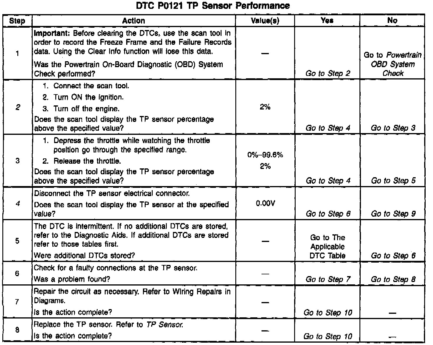 Check the condition of the connector and sensor terminals for moisture or corrosion. Clean the connector and sensor terminals for moisture or corrosion. Replace the connector and sensor terminals for moisture or corrosion as necessary. If corrosion is found, check the condition of the connector seal, and repair or replace the connector seal as necessary. If DTC P0121 is intermittent. Refer to the Driveability Symptom Tables.