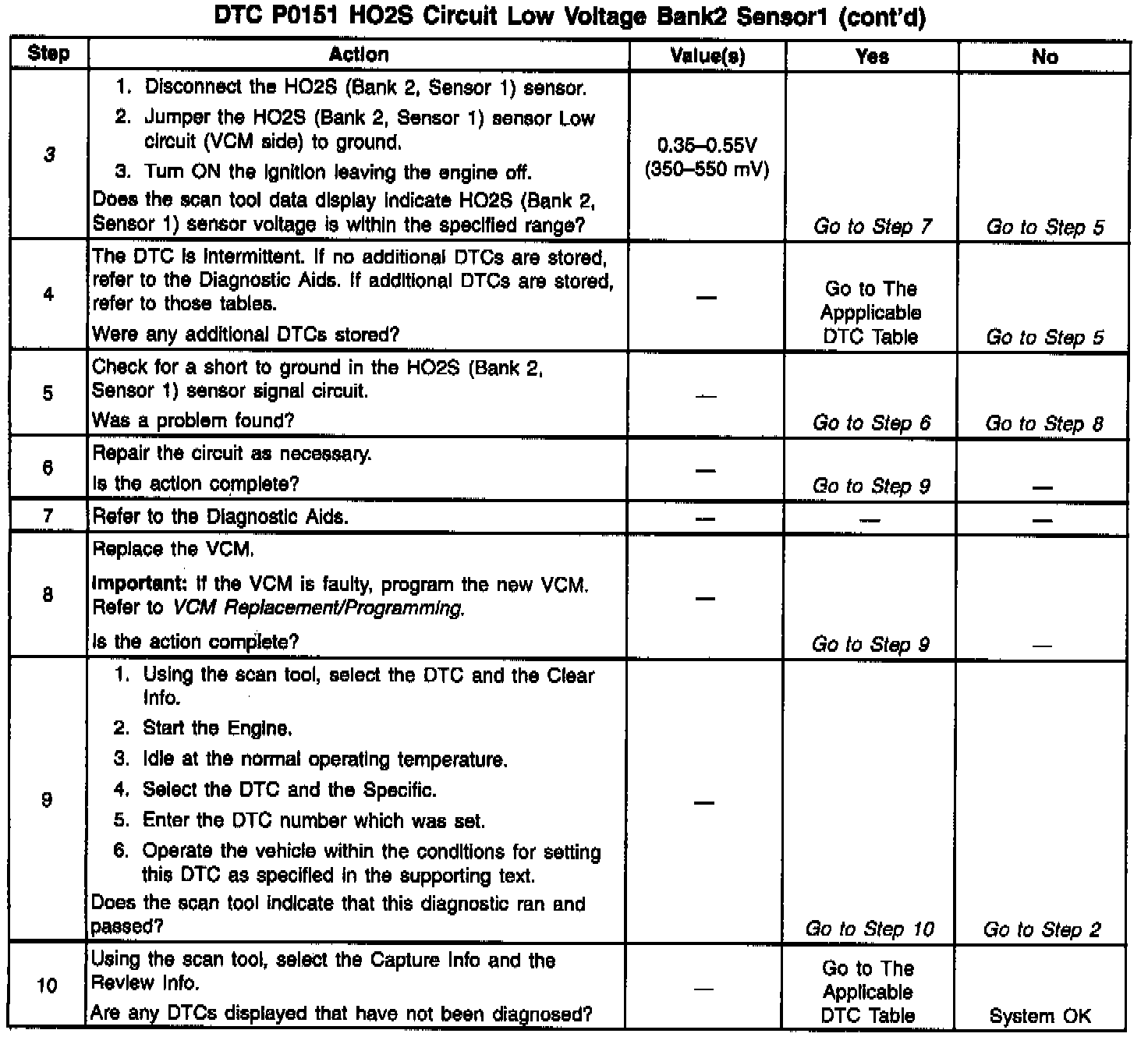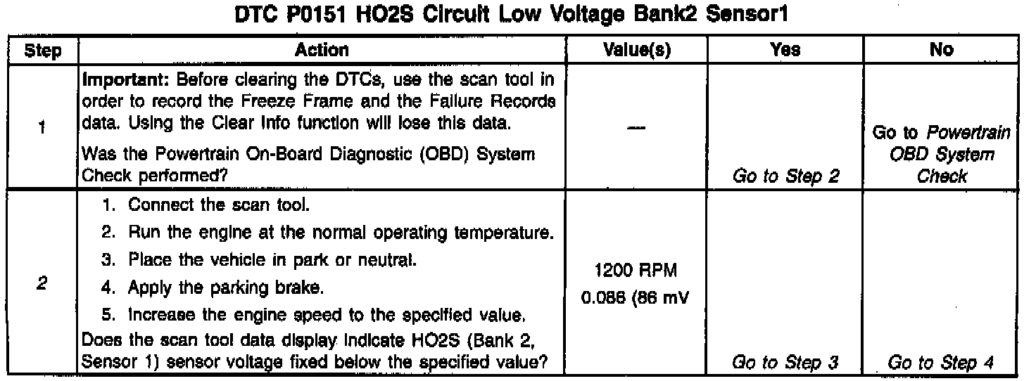 The VCM supplies a voltage of about 0.45 volt (450 mV) between the HO2S High and HO2S Low circuits. (If measured with a megohm digital voltmeter, this may read as low as 0.32 volt.) The Heated Oxygen Sensor (HO2S Bank 2 Sensor 1) varies the voltage within the range of about 1.0 volt (1000 mV) if the exhaust is rich, down to about 0.10 volt (100 mV) if the exhaust is lean. The DTC P0151 is a type A DTC.
