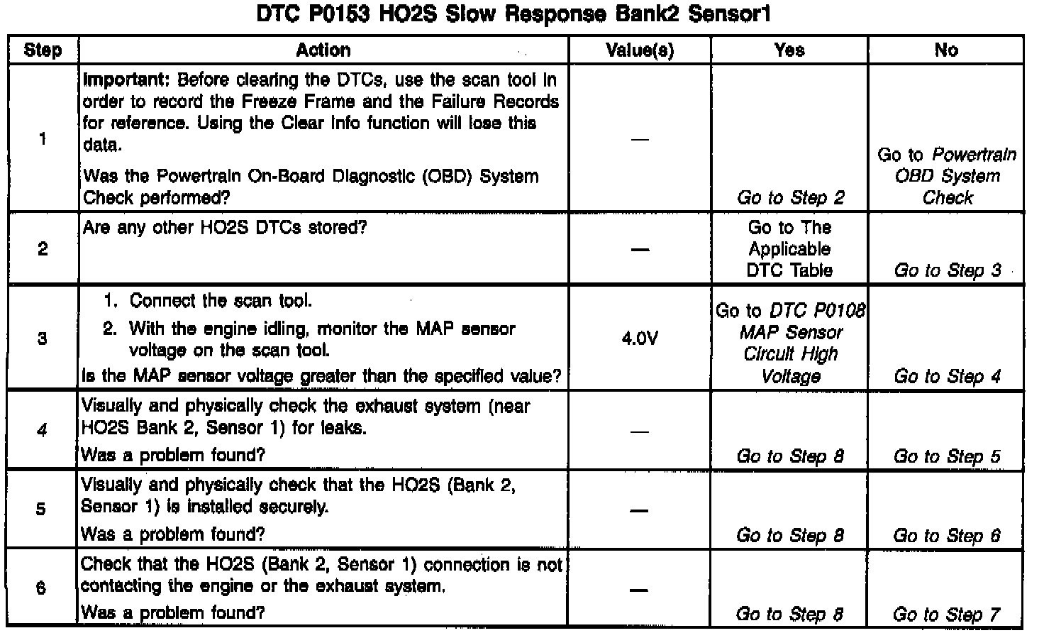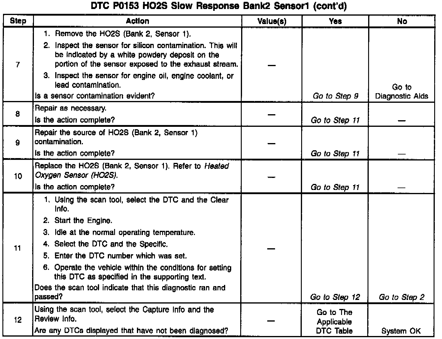 The HO2S heater provides for a taster sensor warm-up which allows the sensor to become active in a shorter period of time and remain active during a long extended idle. The DTC P0153 determines if the HO2S is functioning properly by checking its response time. This DTC is a type B DTC.
