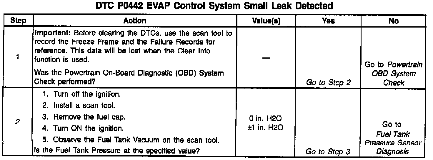 The evaporative leak detection diagnostic strategy is based on applying a vacuum to the EVAP system and monitoring the vacuum decay. The VCM monitors vacuum level via the fuel tank vacuum sensor input. At an appropriate time, the EVAP purge solenoid and the EVAP vent solenoid are turned on, allowing the engine vacuum to draw a small vacuum on the entire evaporative emission system. After the desired vacuum level has been achieved, the EVAP purge solenoid turns OFF, sealing the system. A leak is detected by monitoring for a decrease in the vacuum level over a given time period with all other variables remaining constant. A small leak in the system will cause DTC P0442 to be set. This DTC is a Type A DTC.