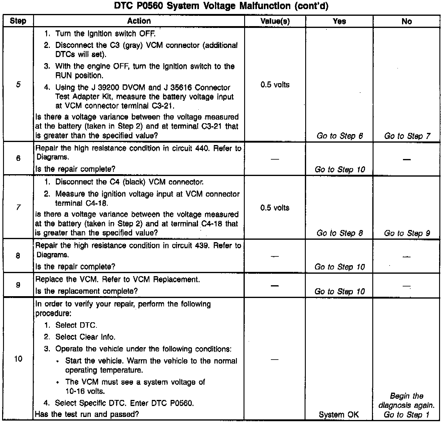 Circuit 439 is the ignition voltage feed for the VCM. Circuit 440 is the battery voltage feed for the VCM. When the VCM detects a low voltage or a high voltage, then DTC P0560 sets. DTC P0560 is a type D DTC.