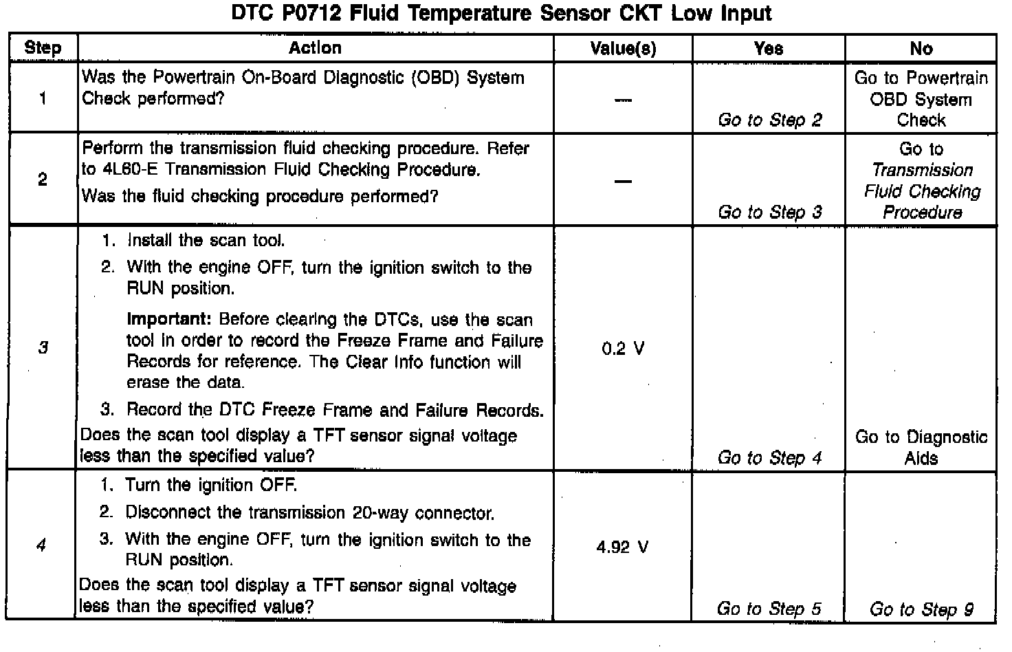 When the VCM detects a continuous short to ground in the TFT signal circuit or in the TFT sensor, then DTC P0712 sets. DTC P0712 is a type B DTC.