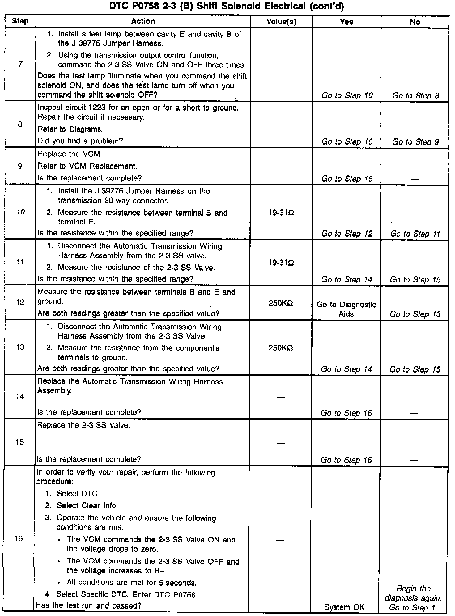 When the VCM detects a continuous open or short to ground in the 2-3 SS Valve circuit or the 2-3 SS Valve, then DTC P0758 sets. DTC P0758 is a type A DTC.