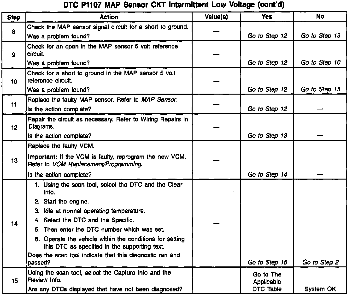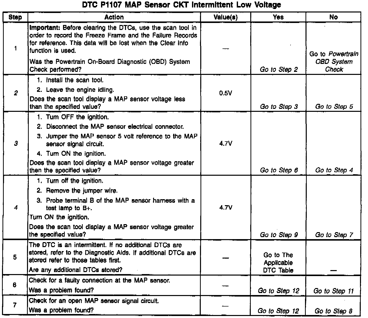 An intermittent open in the MAP sensor signal circuit or the 5 volt reference circuit will result in a DTC P1107.