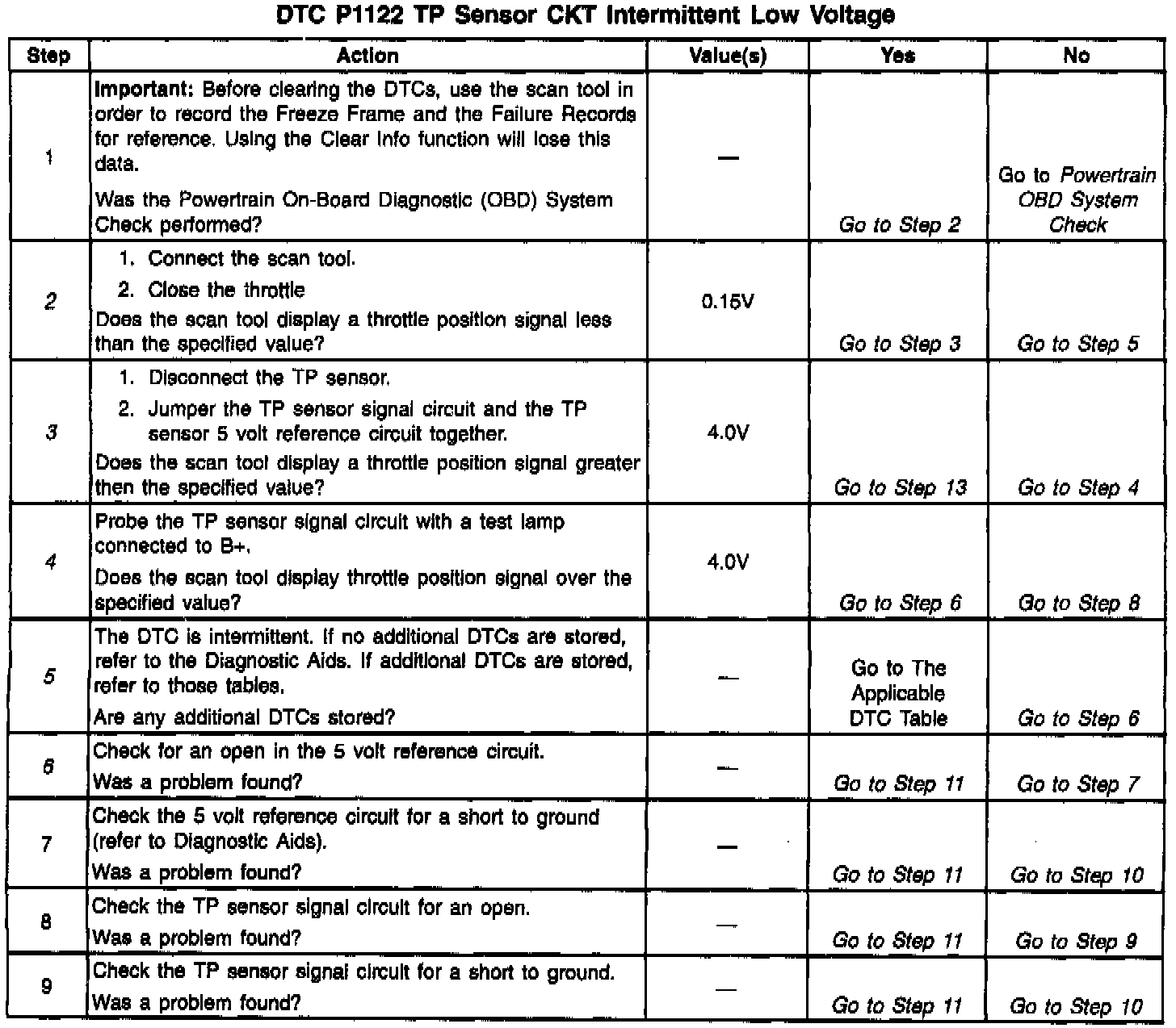 A DTC P0123 will result if the TP ground circuit is open or the TP signal circuit is shorted to the voltage. A DTC P0122 will result if an open or a short to ground in the 5 volt reference circuit or the TP sensor signal circuit.