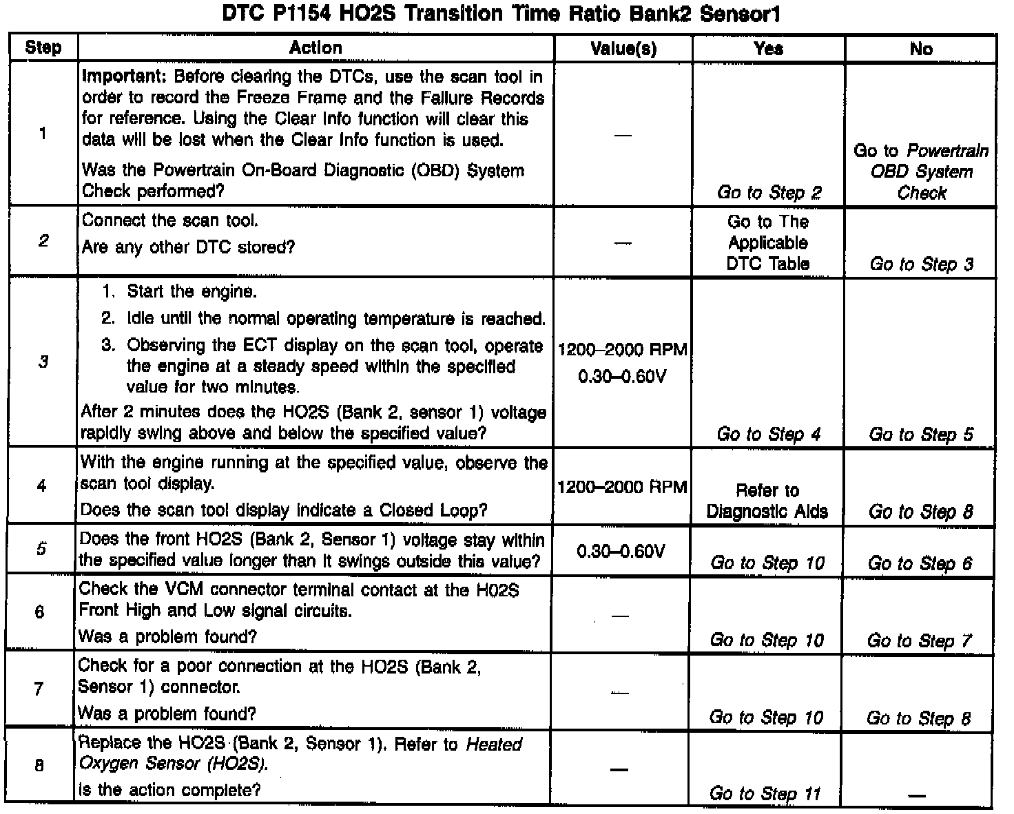 Use this diagnostic test in conjunction with the HO2S (Bank 2, Sensor 1) slow response diagnostic test (P0153). The ratio of the response times that were calculated are compared to the calibrated limits. If the number of both the lean to rich transitions (switches) and the rich to lean transitions were both zero, then the ratios will set to 0. Otherwise, the ratio is calculated based on which average response time was greater. DTC P1154 is a type B DTC.