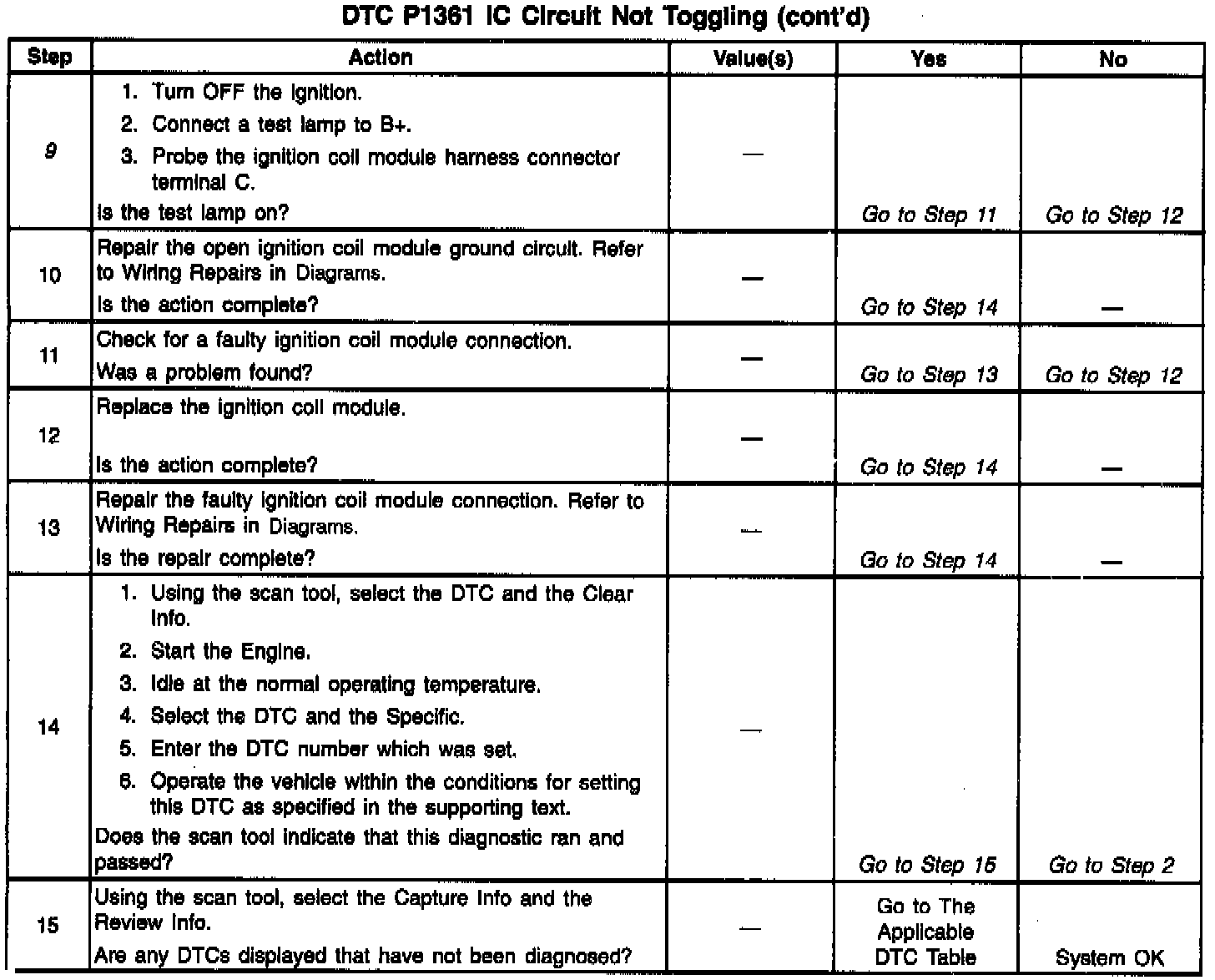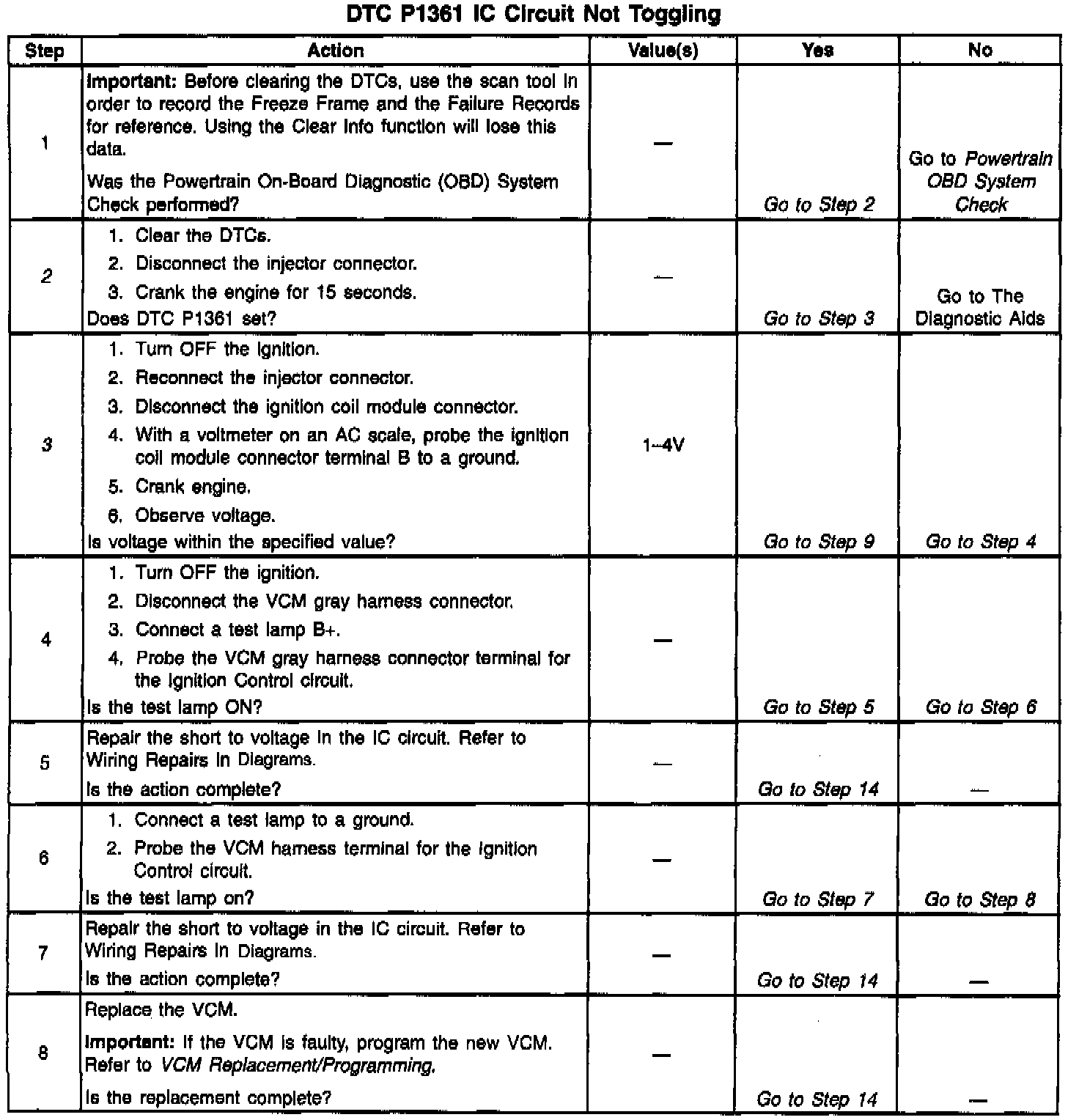 9. The remaining tests begins to check that the ignition coil module circuitry is OK. If the ignition coil module loses its voltage source, the secondary voltage will not be produced, and a DTC P1361 will set.