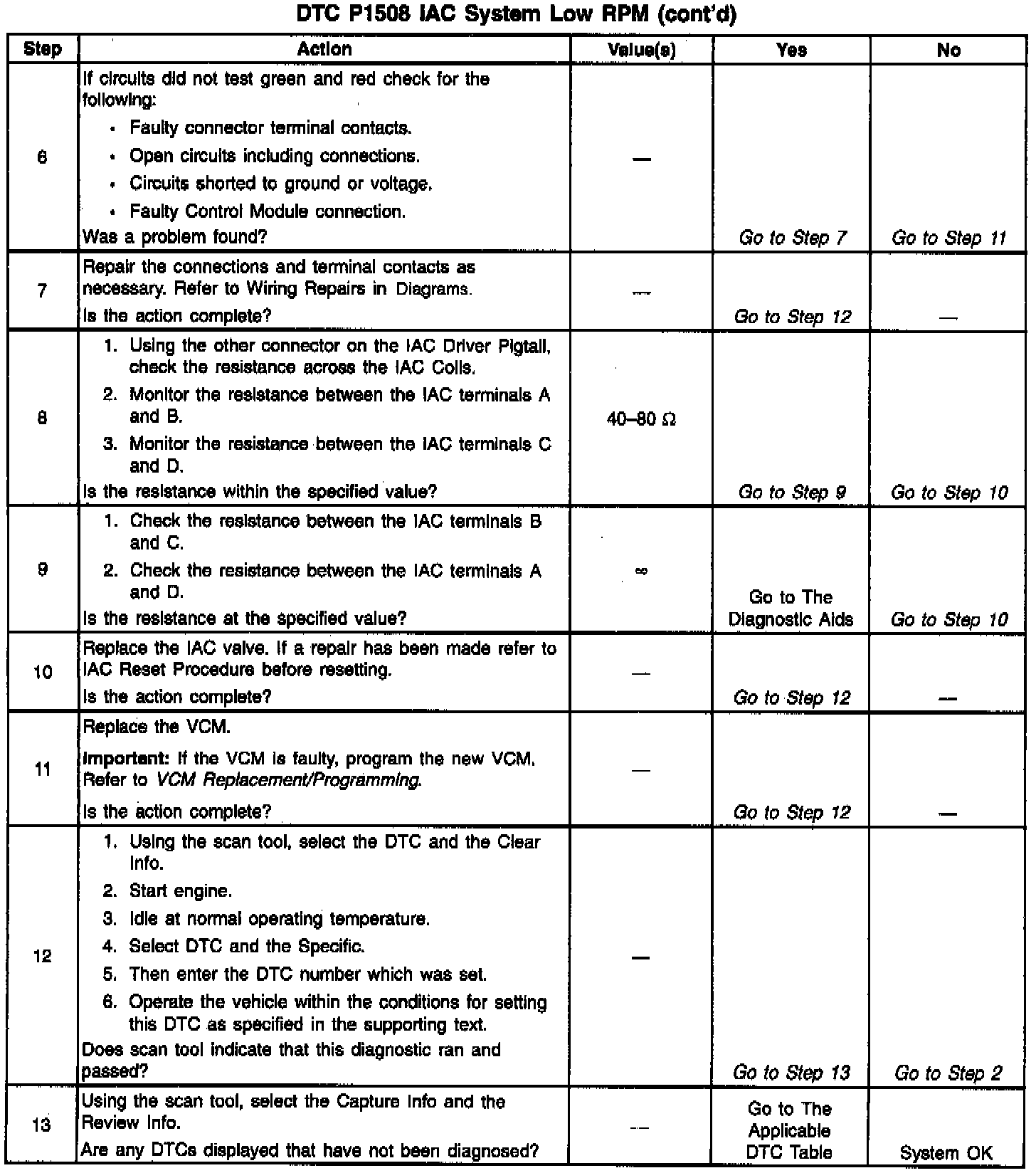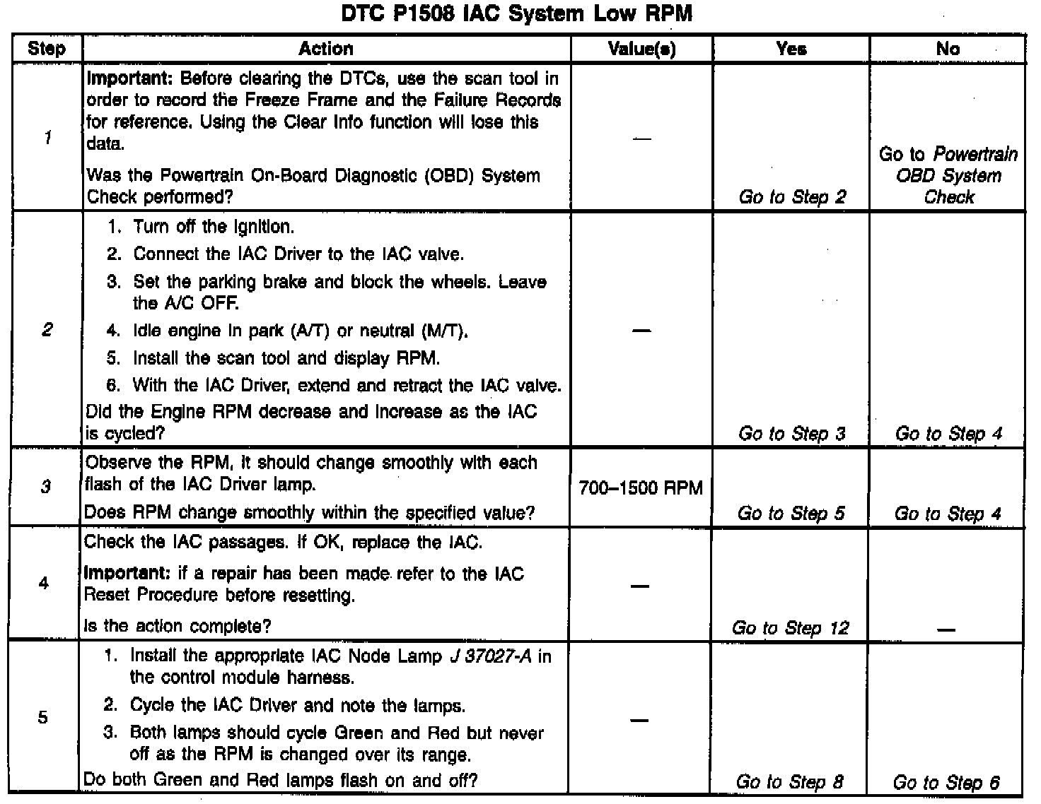 2. This step checks the quality of the IAC movement in Step 1. Between 700 RPM and about 1200 RPM, the engine speed should change smoothly with each flash of the tester lamp in both extend and retract. If the IAC valve is retracted beyond the control range (about 1500 RPM), it may take many flashes in the extend position before engine speed will begin to drop. This is normal on certain engines, fully extending IAC may cause engine stall. This may be normal.