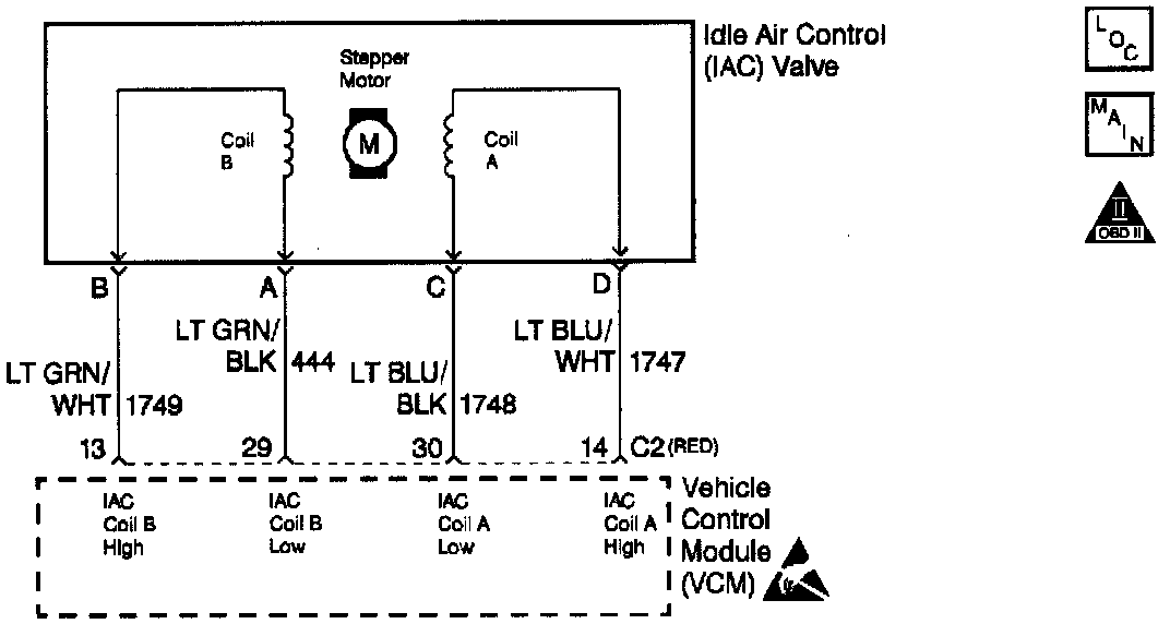 The VCM controls idle speed with an Idle Air Control (IAC) valve to a calculated desired RPM based on sensor inputs and actual engine RPM. The VCM uses 4 circuits to move an Idle Air Control (IAC) valve, allowing varying amounts of air flow into the intake manifold. In order to increase idle RPM, the VCM moves the IAC valve out, allowing more air to bypass the throttle plate. In order to decrease RPM, the VCM will move the IAC valve in, reducing the amount of air bypassing the throttle plate. A scan tool reads the VCM commands to the IAC valve in counts. The higher the counts, the more air that is allowed to bypass the throttle plate (higher idle). The lower the counts, the less air that is allowed to bypass the throttle plates (lower idle). This is a type B DTC.